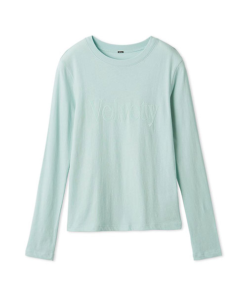 “なめらかで柔らかい”といった意味の「Velvety」という言葉を、ロゴタイポにしてプリント。ベロアライクな光沢が特長のフロッキープリント加工で、言葉の持つ優しい響きを表現しています。