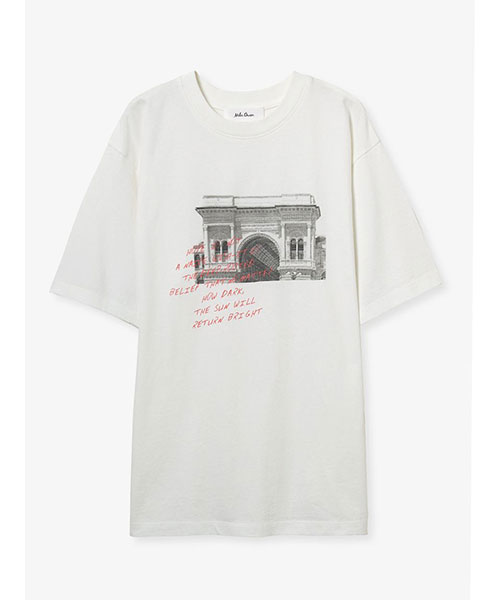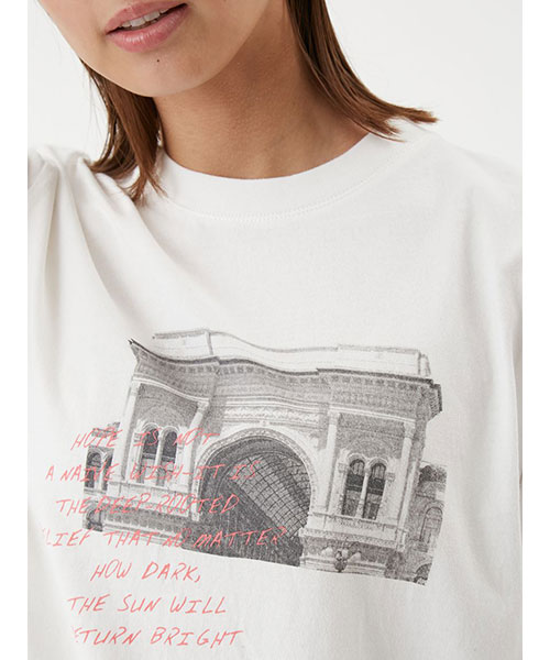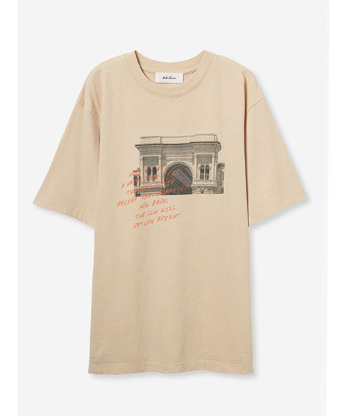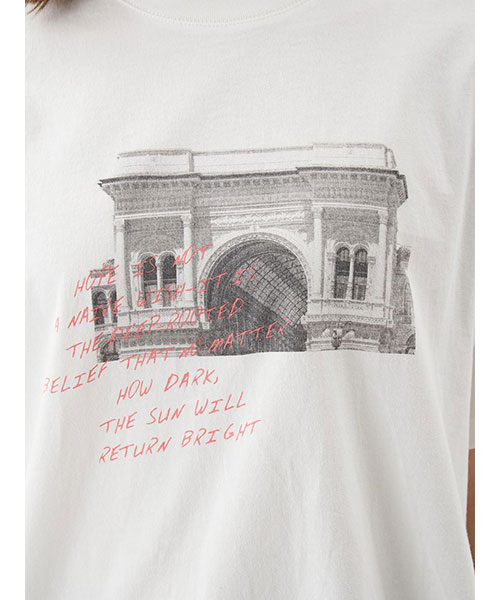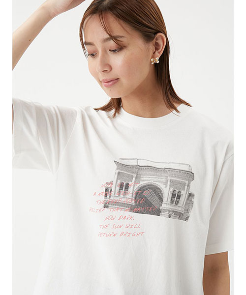 モノクロームのフォトに、鮮やかカラーの手書きグラフィックをONした、大人のためのTシャツです。