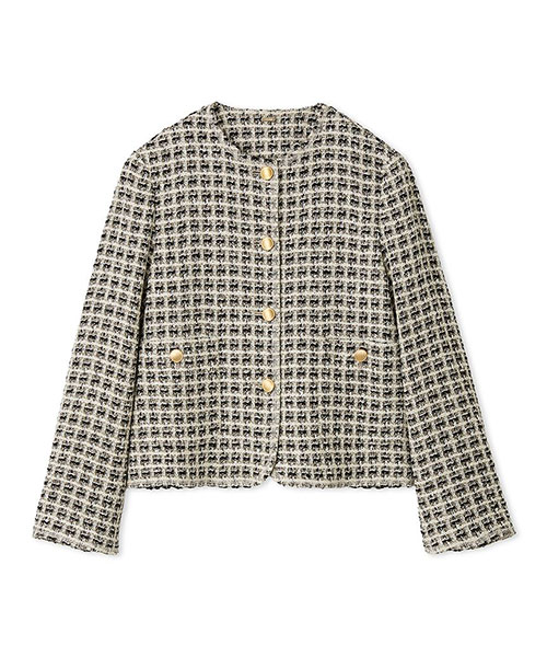 【人気のノーカラージャケットが、洗練されたツイード素材で進化。スタリングが楽しくなる華やかな一枚】【Design/Styling】