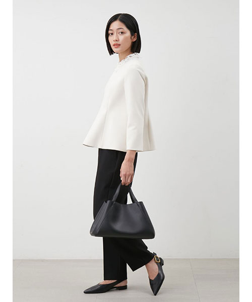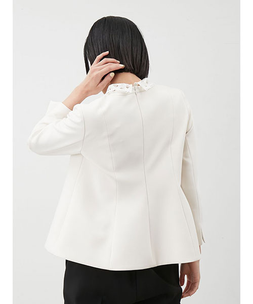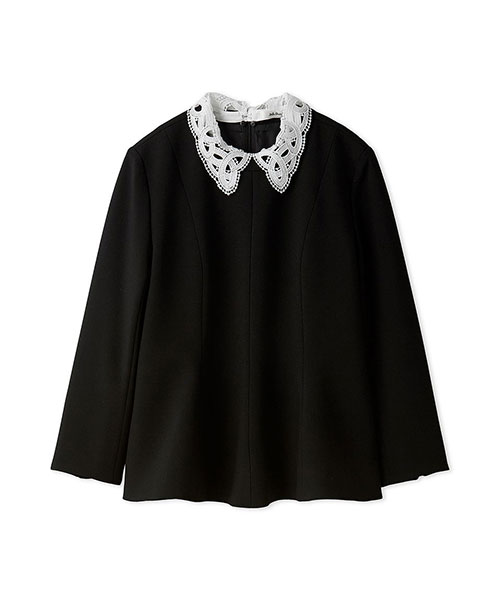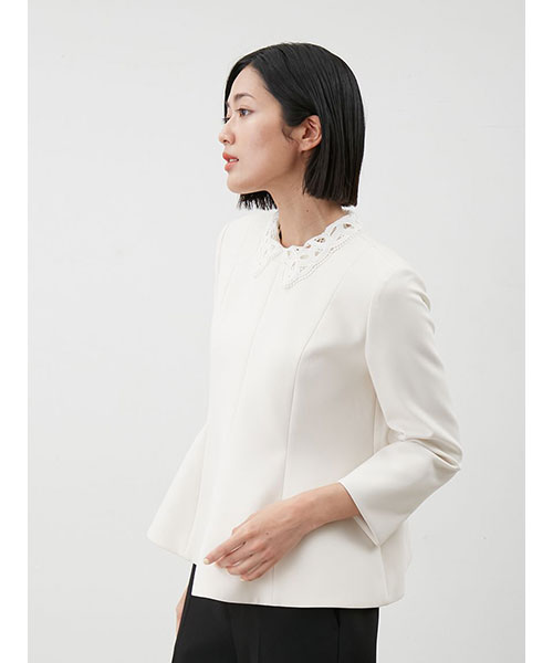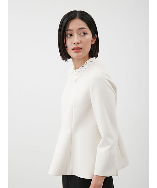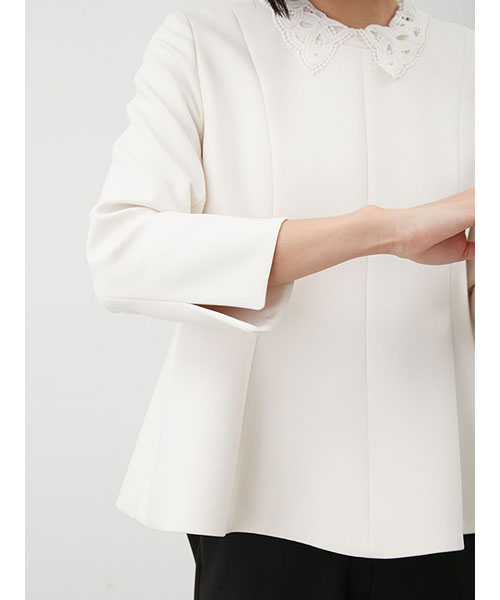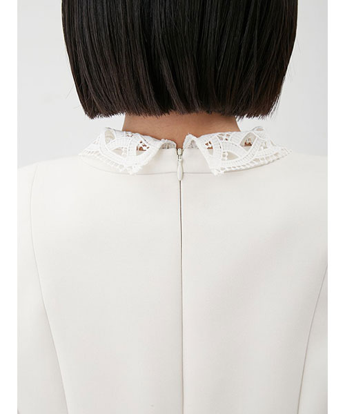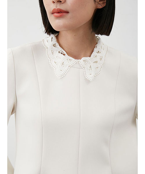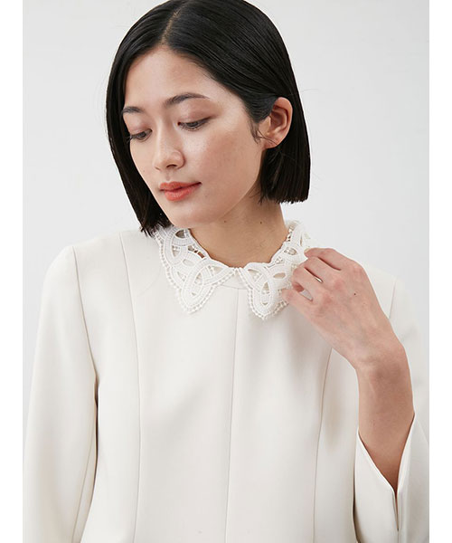 レースの付け襟は取り外し可能。襟を外すと、ネックには切り替えが入っているデザインで、モードな印象に。シーンによって着回しも可能です。