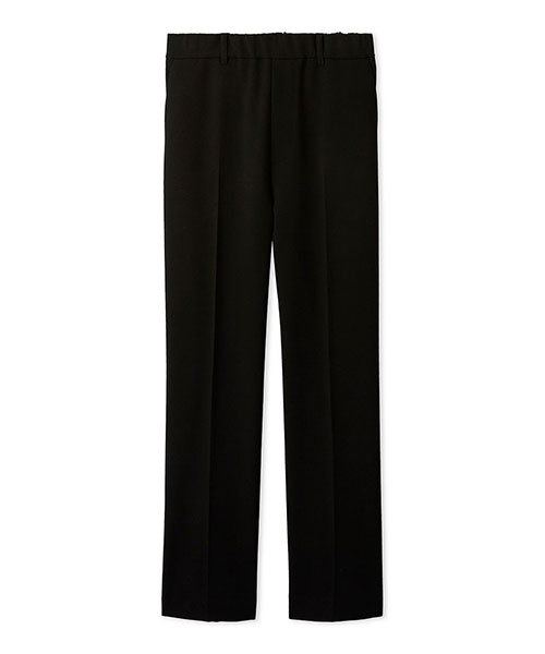 パンツはセンタープレスが利いてすっきりとしたテーパードシルエット。きれいめに見えますが、ウエストがぐるりゴムで快適な穿き心地。