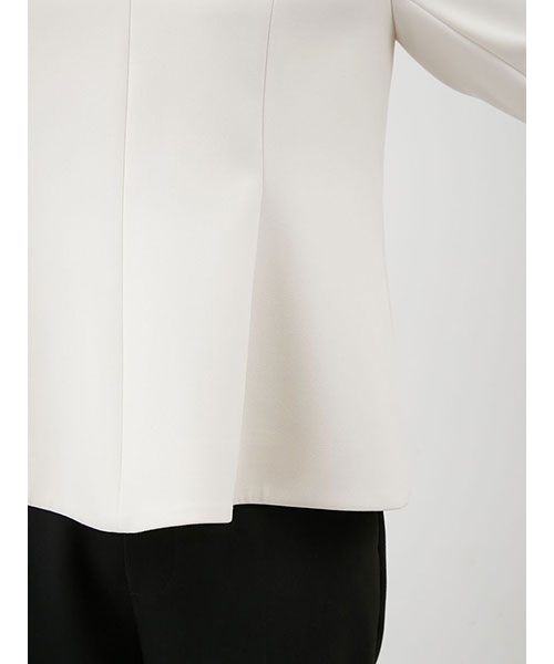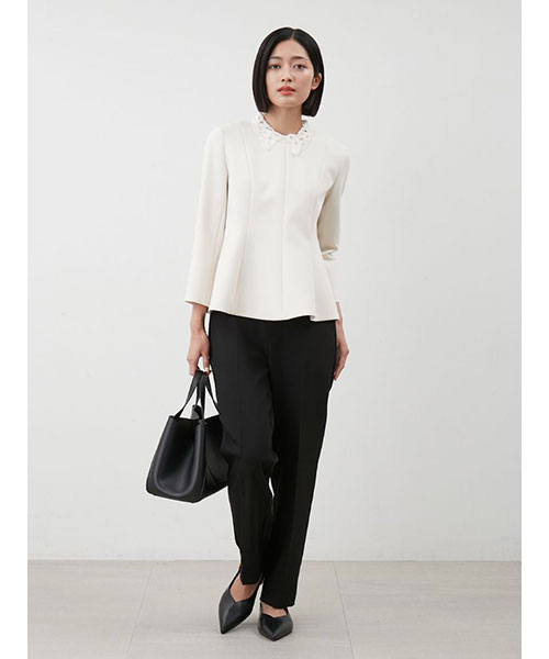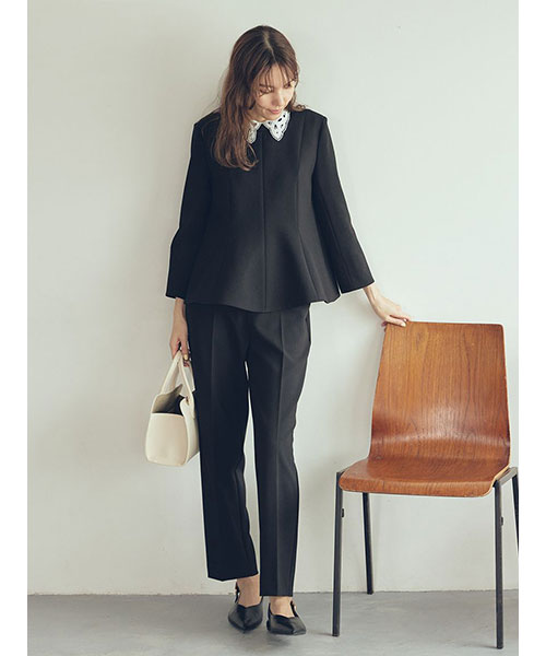 トップスは立体的なペプラムシルエットが特徴で、袖は手首が美しく見える7分丈。