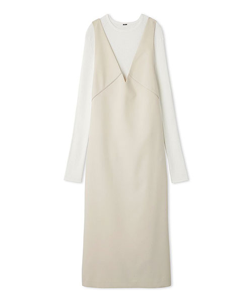 ワンピはシャープな切り替えラインがモードな印象。前から見ると深いVネック、後ろから見るとキャミワンピに見えるデザインです。