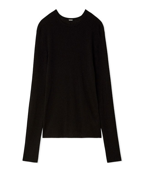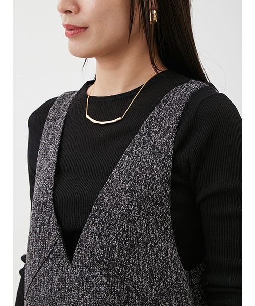 インナーのリブニットは、シンプルなクルーネック。まだまだ暑い時期にも便利に活用できる、程よいソフトな素材です。長めの袖で、くしゅっとさせて着るのも◎。