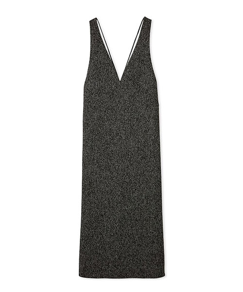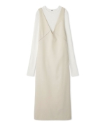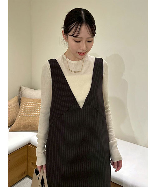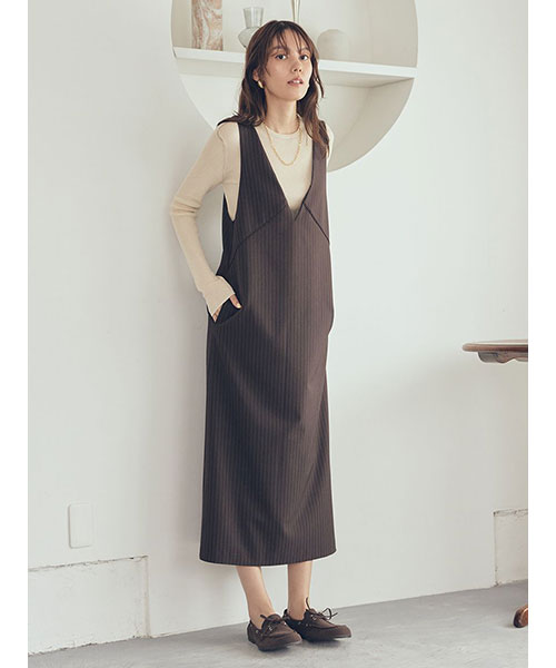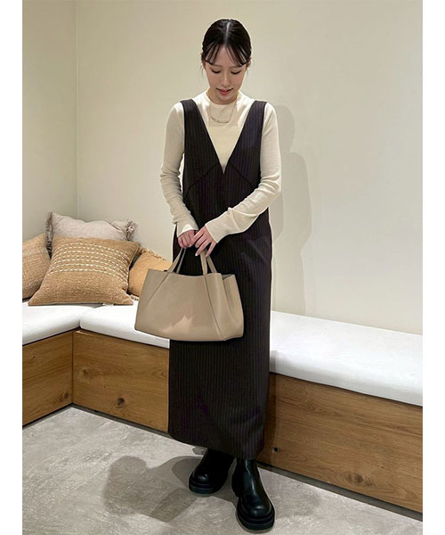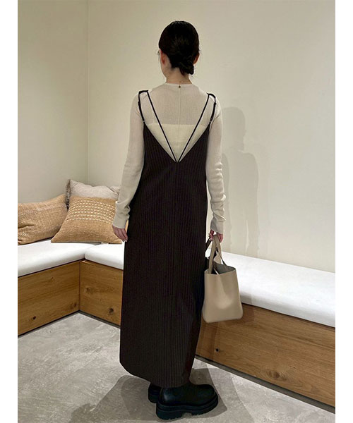 ワンピはシャープな切り替えラインがモードな印象。前から見ると深いVネック、後ろから見るとキャミワンピに見えるデザインです。