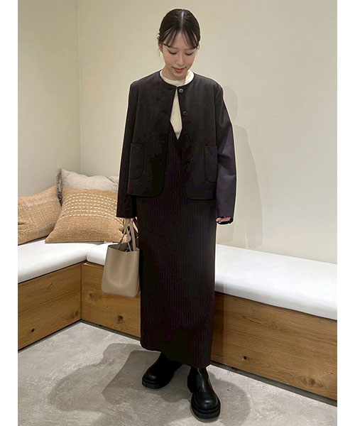 素材 | 表地:【IVR】ポリエステル100% 【BRW】ポリエステル94%、ポリウレタン5%、レーヨン1% 【BLK】ポリエステル92%、レーヨン8% 裏地:ポリエステル100% 【ニット】:レーヨン76%、ナイロン24% |