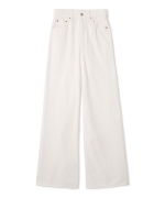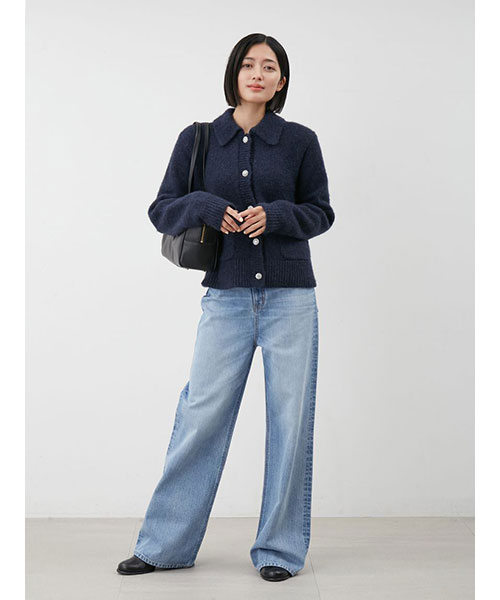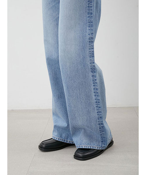 高めに設定したウエスト位置と、すっきりとさせた腰まわり、そしてヒップの下からまっすぐに伸びるワイドなラインで、誰が穿いても脚長美脚シルエットに。
