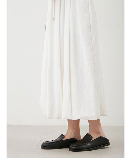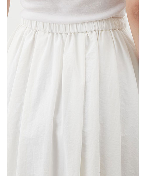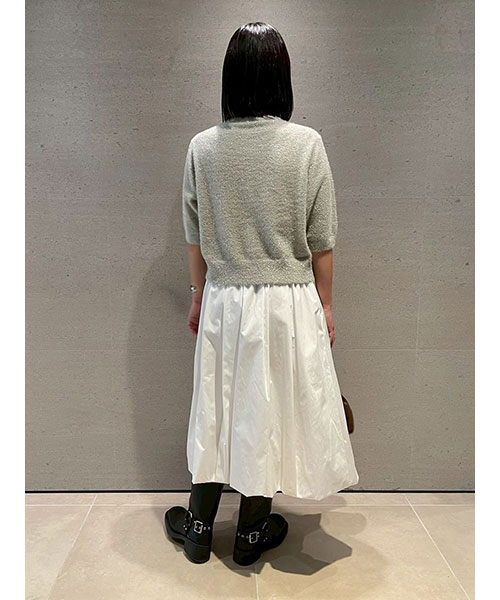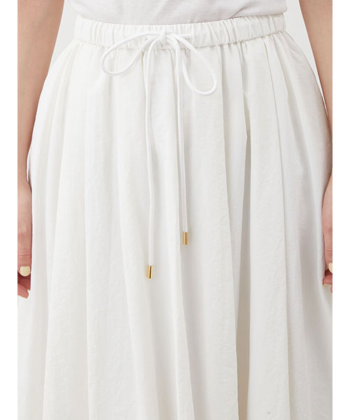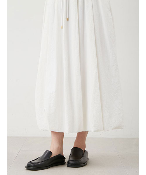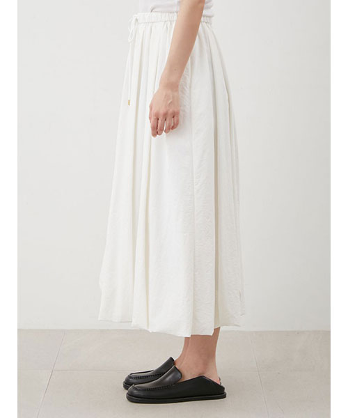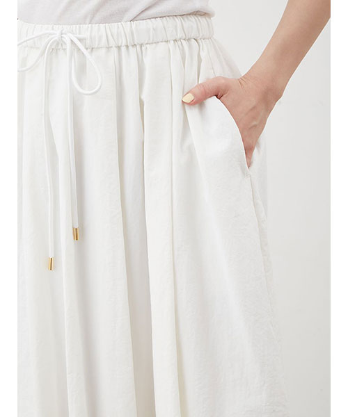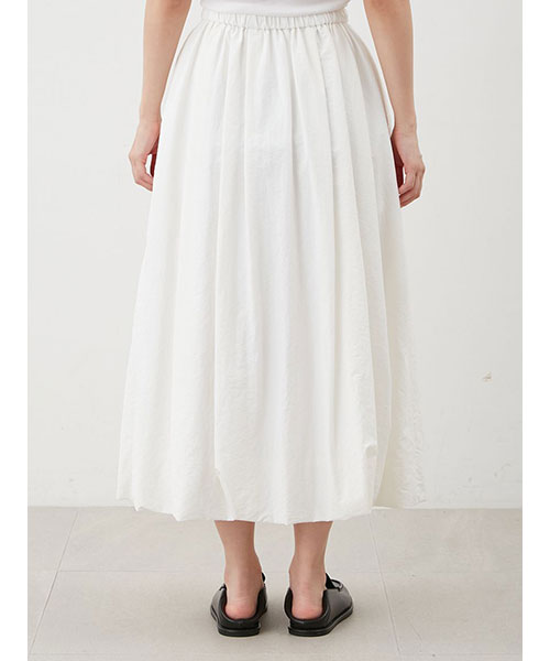 また、ウエストから流れる縦ドレープと裾のエアリーな膨らみ感にこだわり、広がりすぎずすっきり綺麗なシルエットに仕上げています。