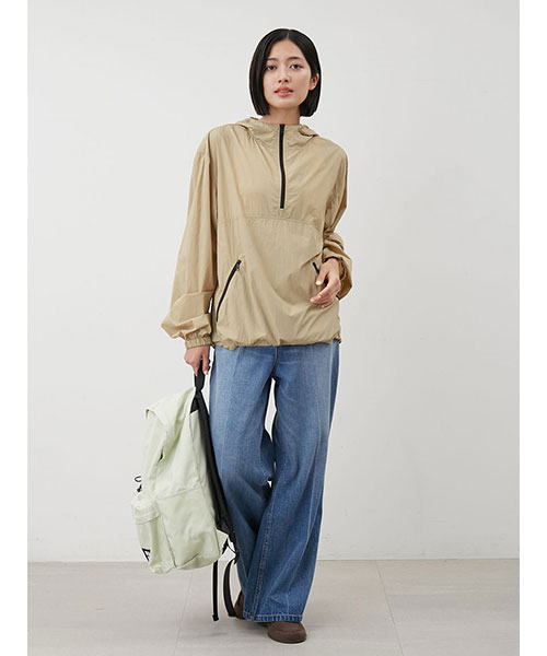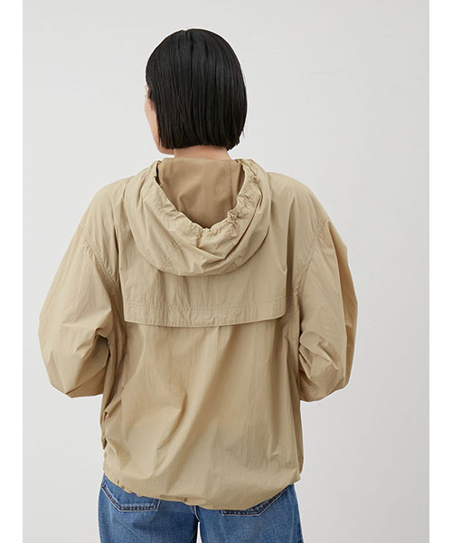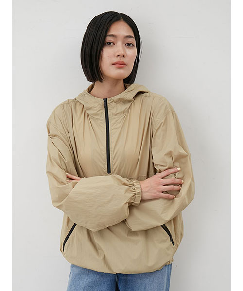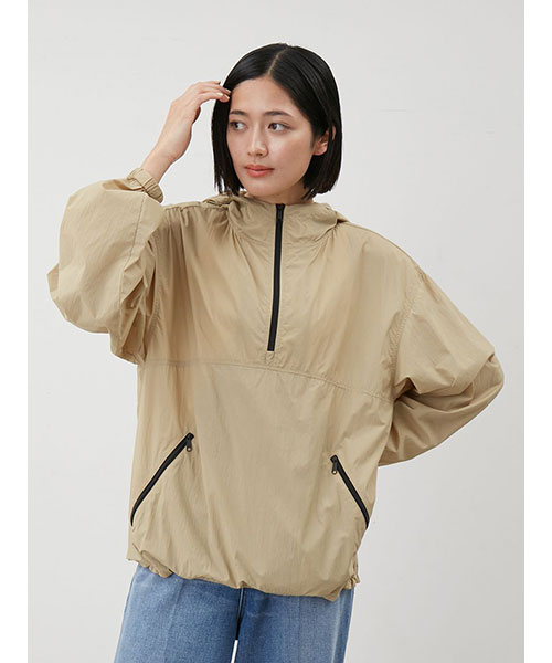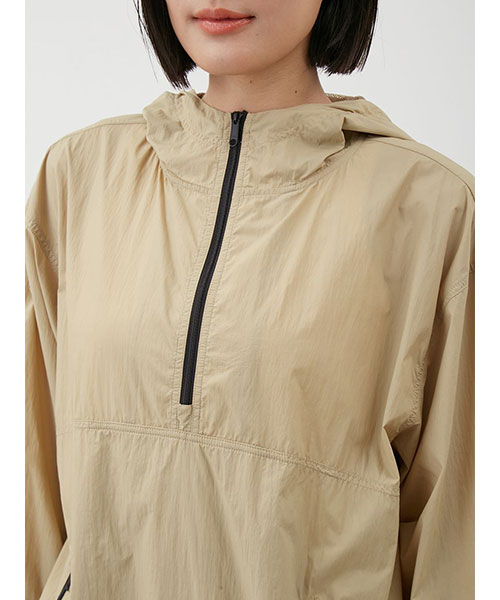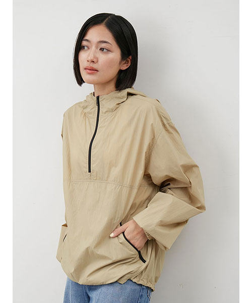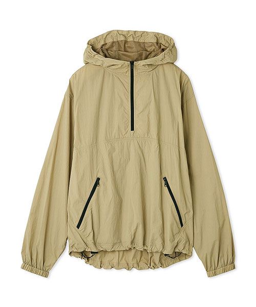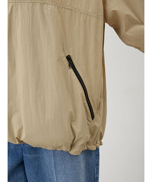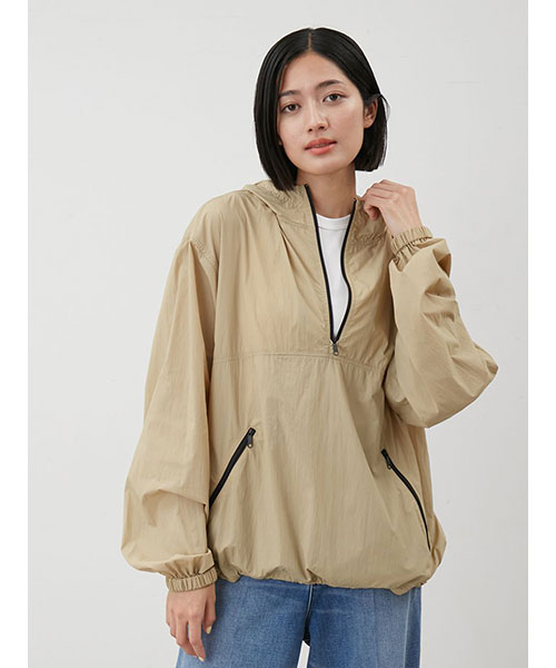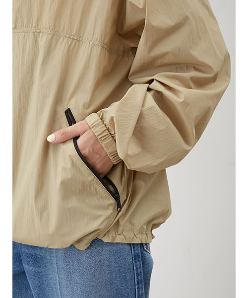 撥水加工のリサイクルナイロンで薄くて軽く、お洒落で実用的な仕様のハーフジップパーカー。