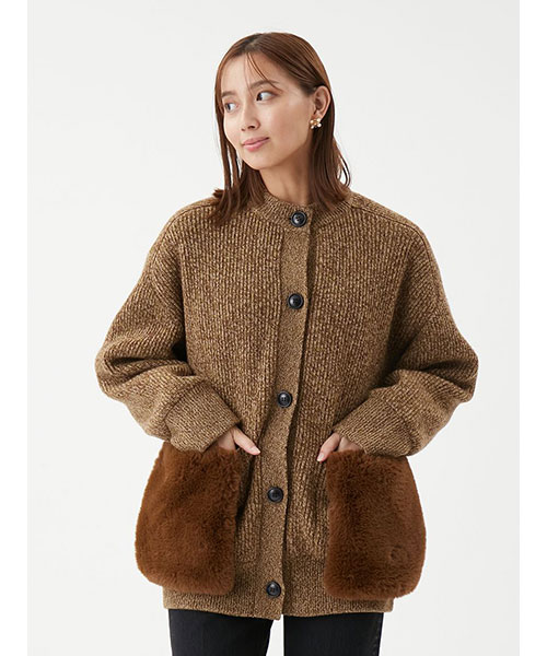 取り外し可能なファーポケットのついた、ニットのカーディガンです。