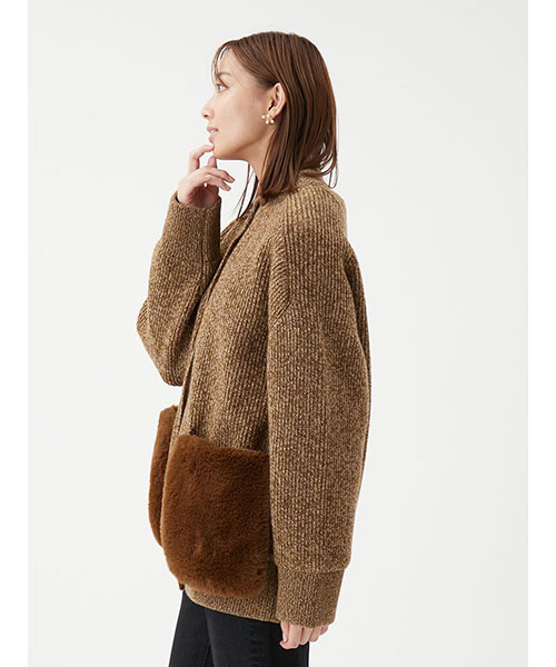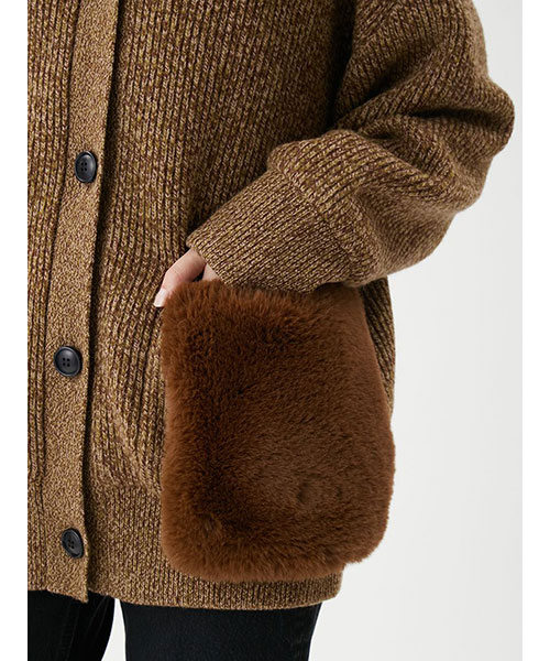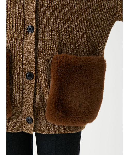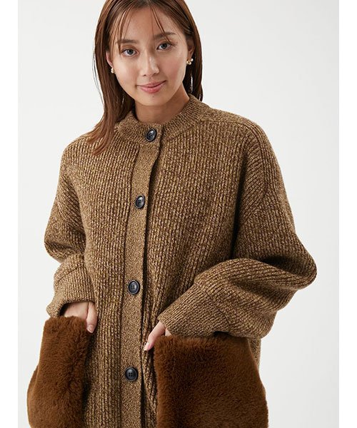 取り外し可能なファーポケットのついた、ニットのカーディガンです。