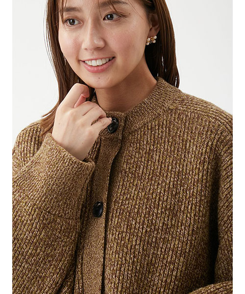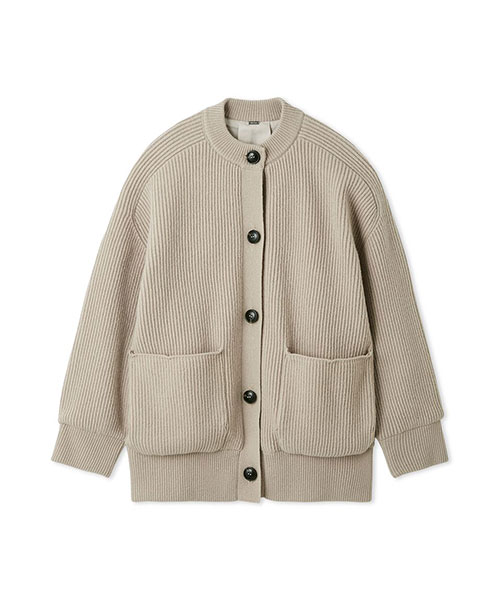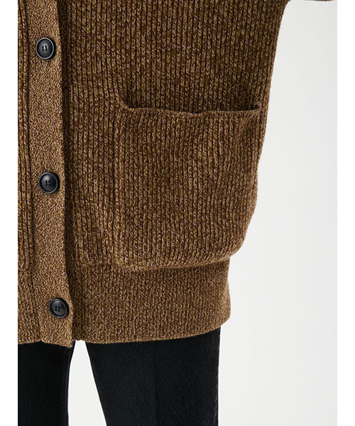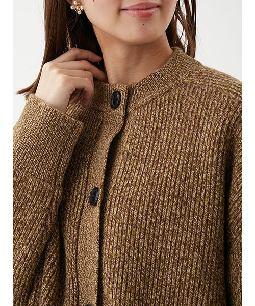 しっかりとした幅のあるリブ編み地に、大きめのボタンで、ポイントづけしているのも特長です。
