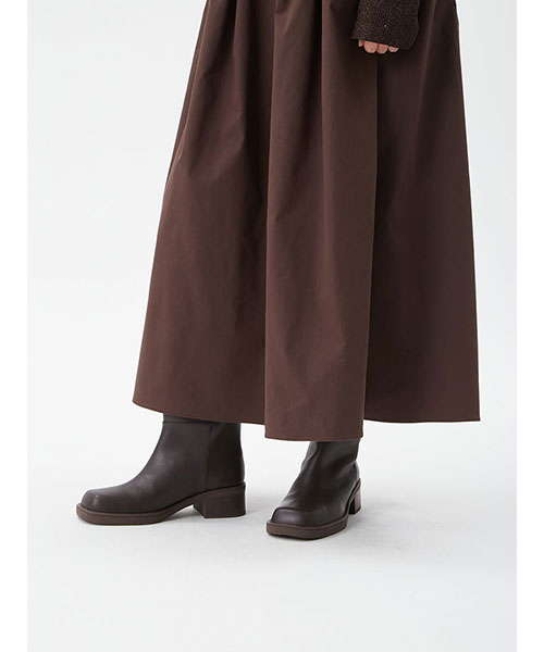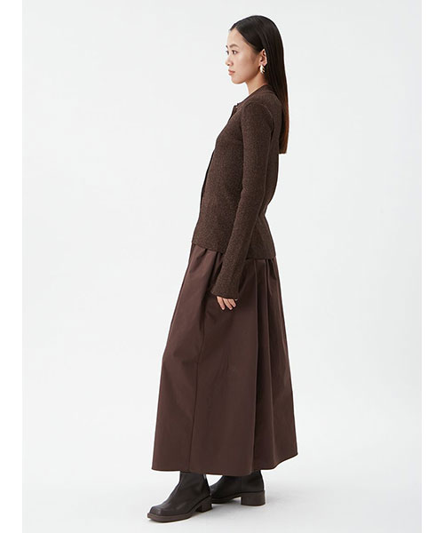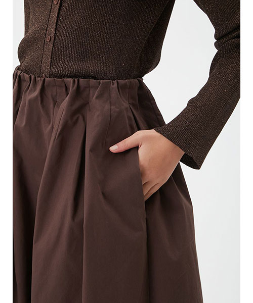 スカートは、光沢感がきれいなモードな印象のデザイン。ハリのある生地にタックとギャザーを寄せてフレアスカートにすることで、ドラマティックなセットアップになるように仕上げています。ウエストはゴムで穿きやすいのもうれしいポイント。