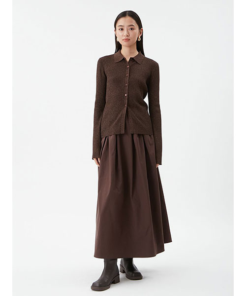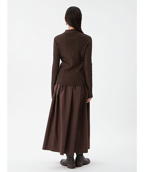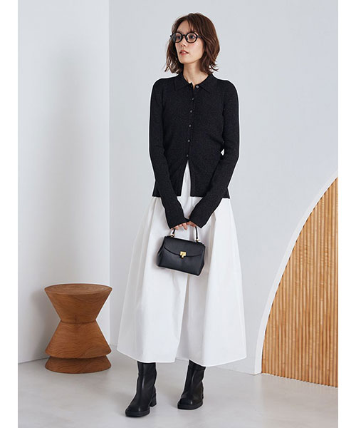 ニットトップスは、程よい肉感とラメ糸でリッチなムード。綿密なサイジングで、フレアスカートとのバランスがよく見えるようにデザインしています。