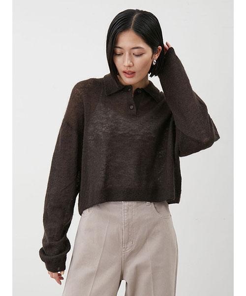 【透け感のある編み地で、残暑でもいち早く秋のムードを楽しめる、モヘア混のポロニット】【Design/Styling】
