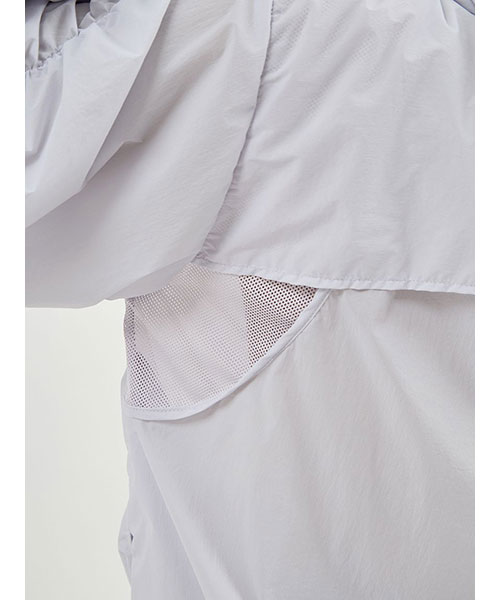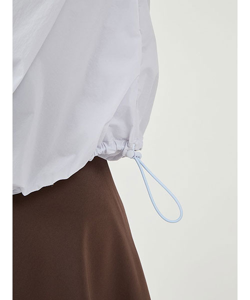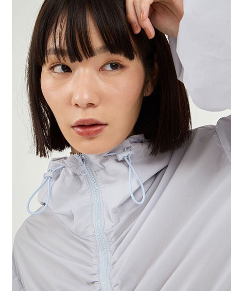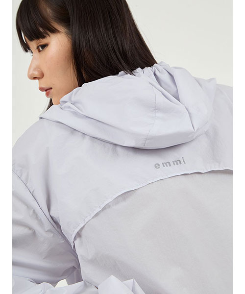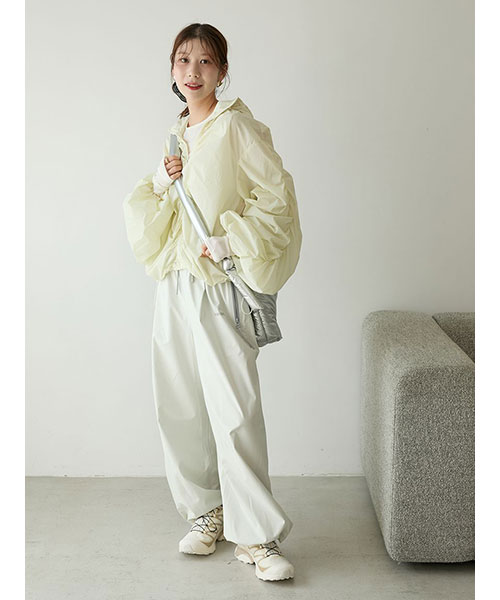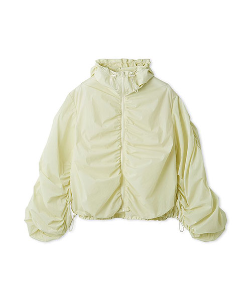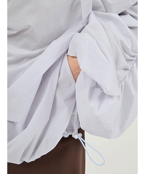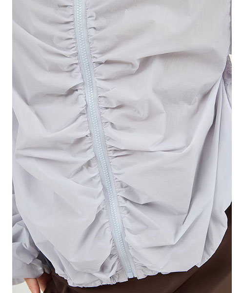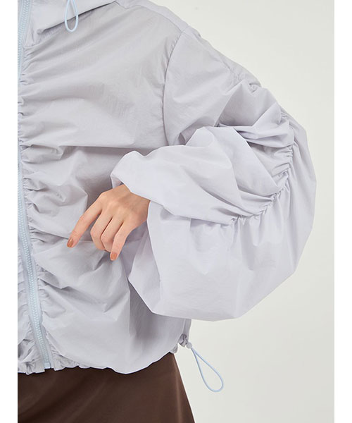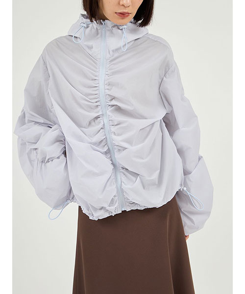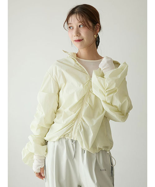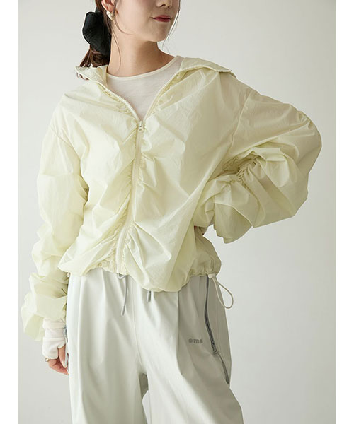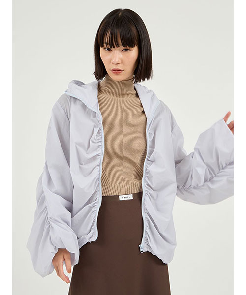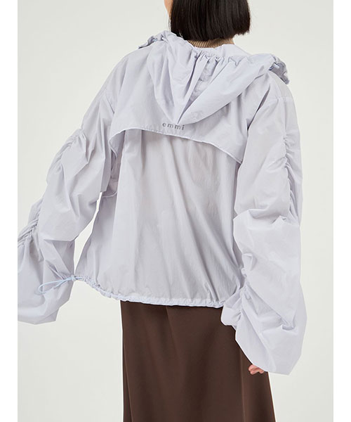 セミシアーのスポーティーな素材にemmiらしいギャザーディテールを身頃、袖にたっぷりとデザインしました。軽く、畳んでもシワになりにくくアウトドアシーンにもトラベルにも長いシーズンで活躍するブルゾン。
