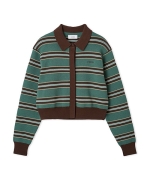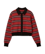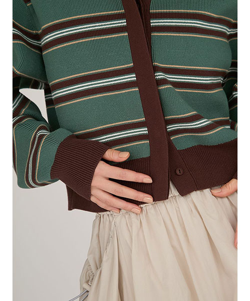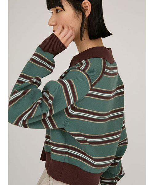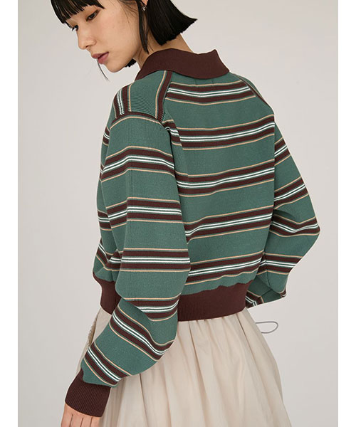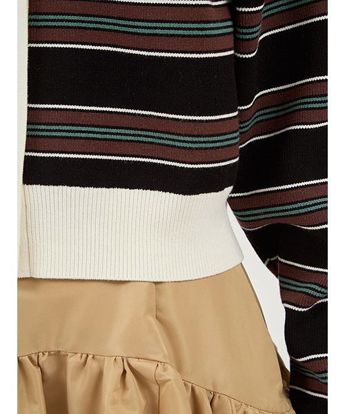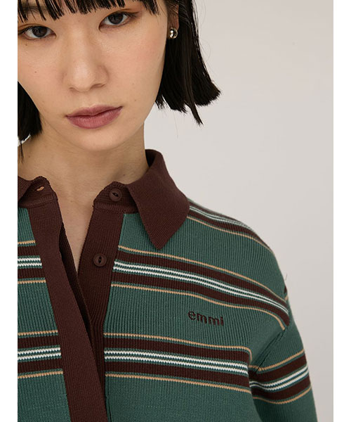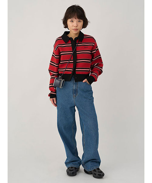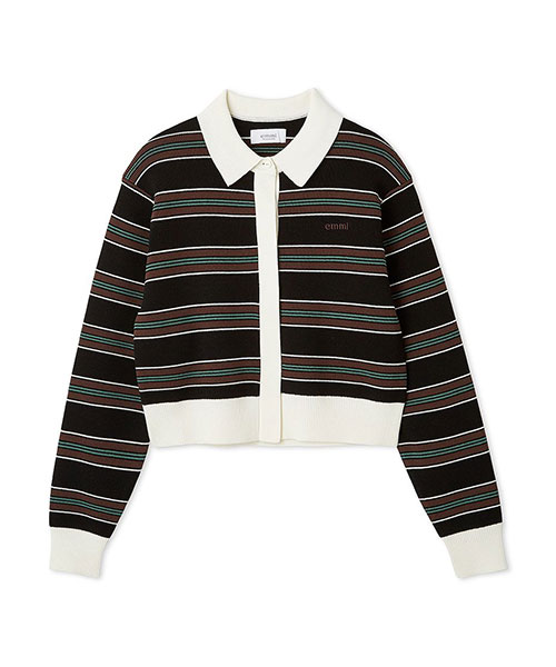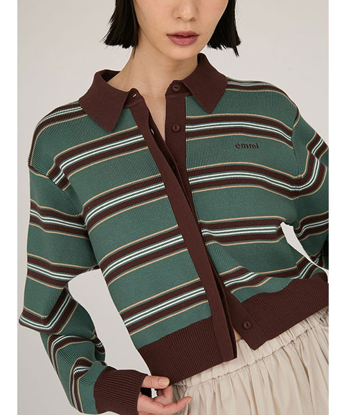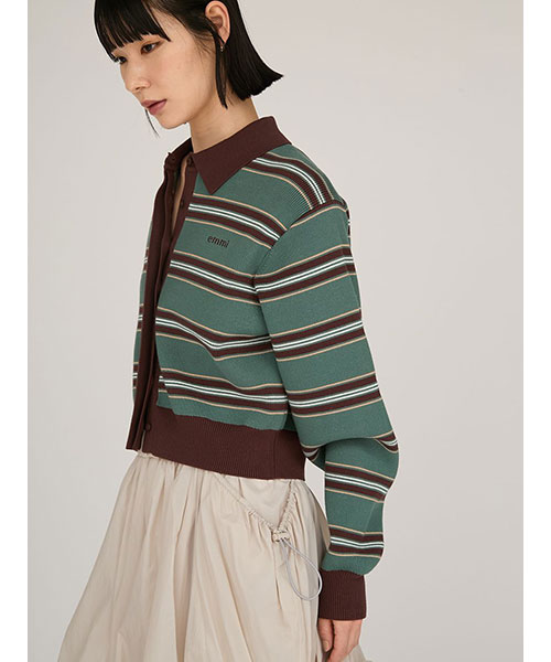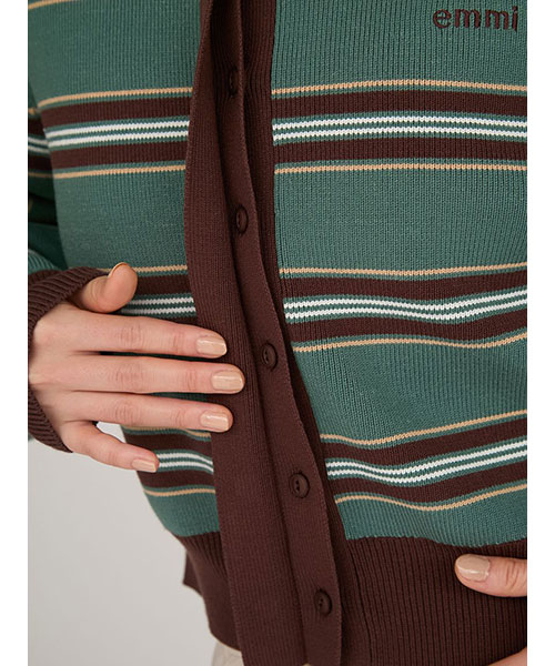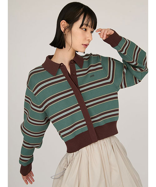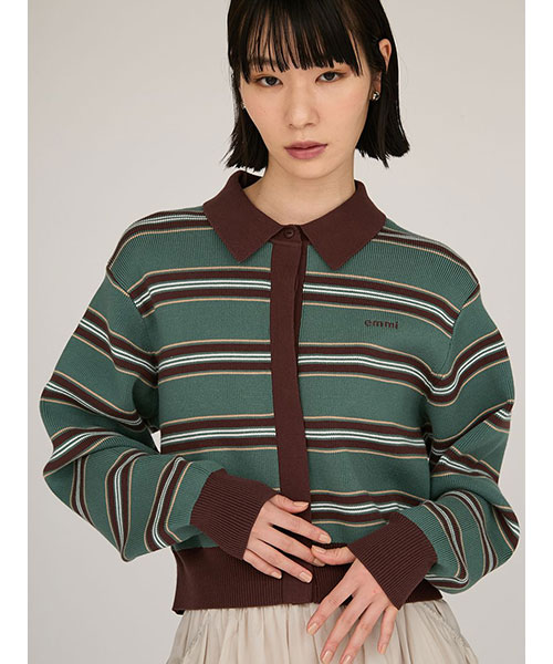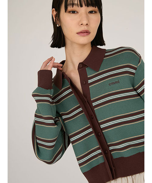 emmiオリジナルのボーダーを全体にあしらったラガーニットカーディガン。胸元にはemmiロゴ刺繍入り。■Coordinate