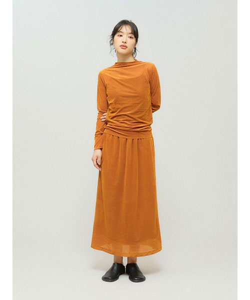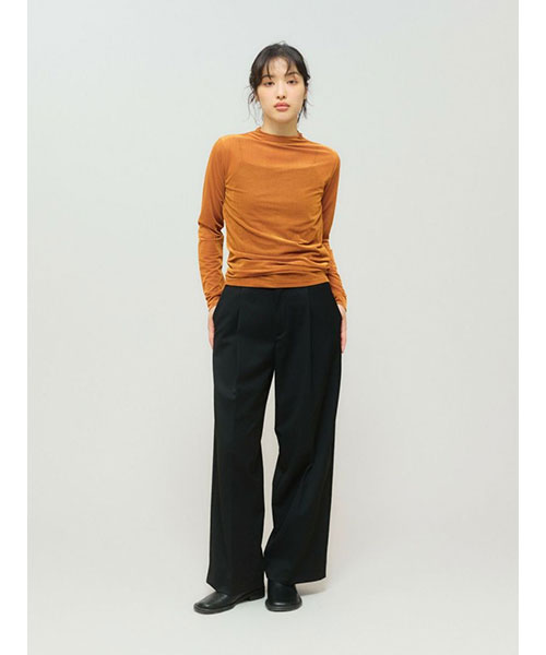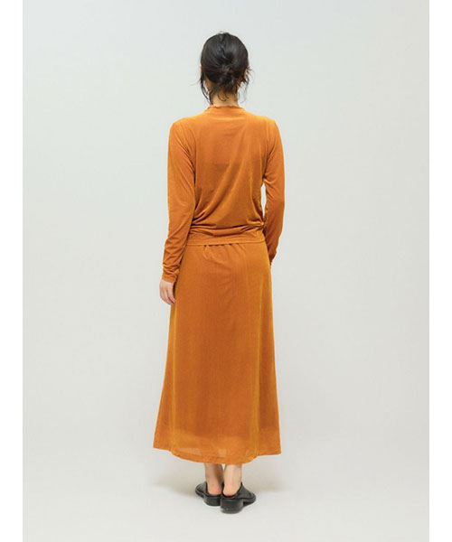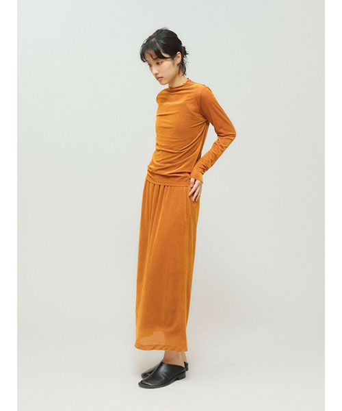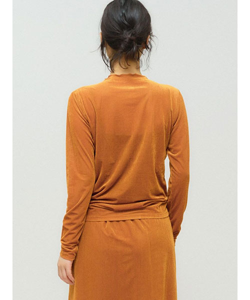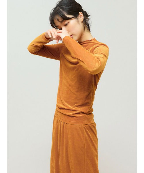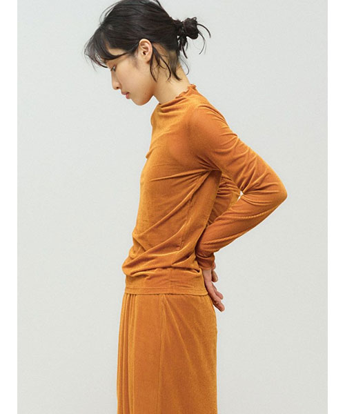シアー素材を使用したシアーベロアリブトップスです。3-162192/シアーベロアリブスカートとのベロアシリーズでデザインしており、セットアップでオケージョン対応にもおすすめの1枚です。タイトなシルエットでインナー使いに重宝します。薄手の生地ですがベロア生地なので温かみがあります。差し色にオレンジを取り入れた華やかなカラーも魅力的。シンプルなデザインなのでベストを重ねたりとオシャレを楽しんでいただけるアイテムです。秋の立ち上がりに重宝していただけます。Point