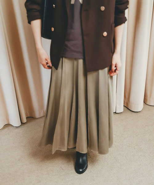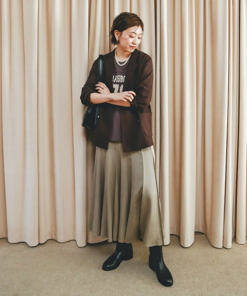 カジュアルなロゴTシャツと合わせて女性らしさをプラスしたり、ノーカラーブラウスと合わせたりジャケットを羽織ってキレイ目にも着まわせます。
