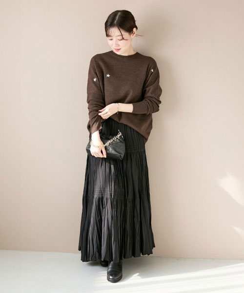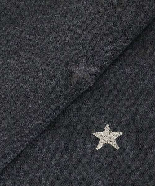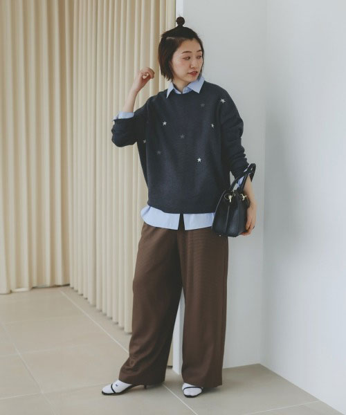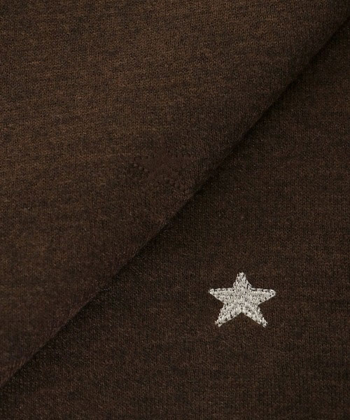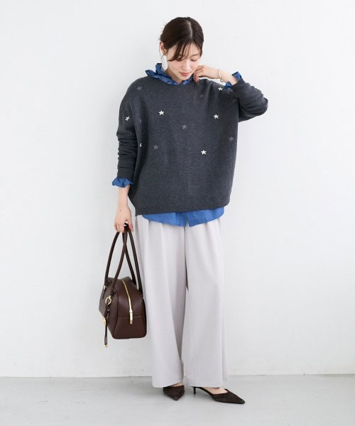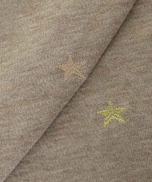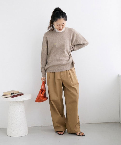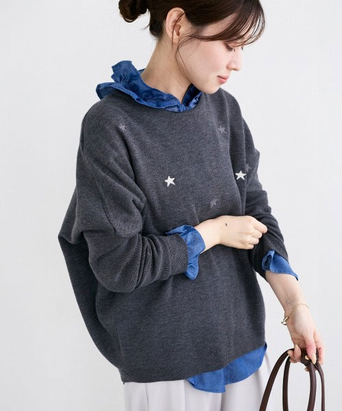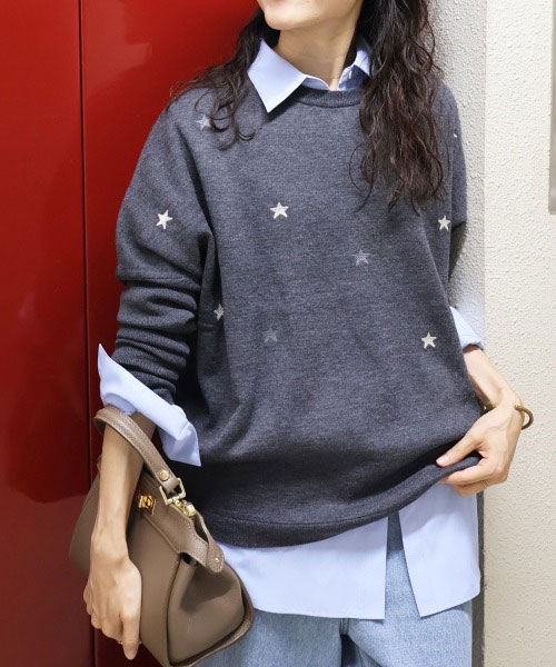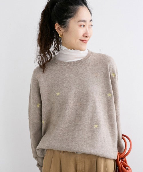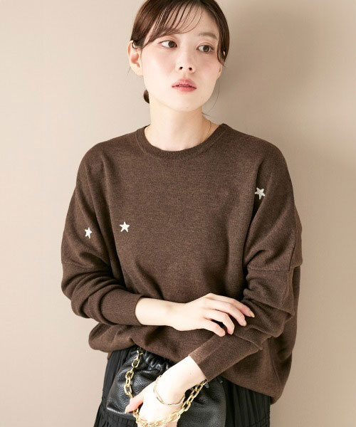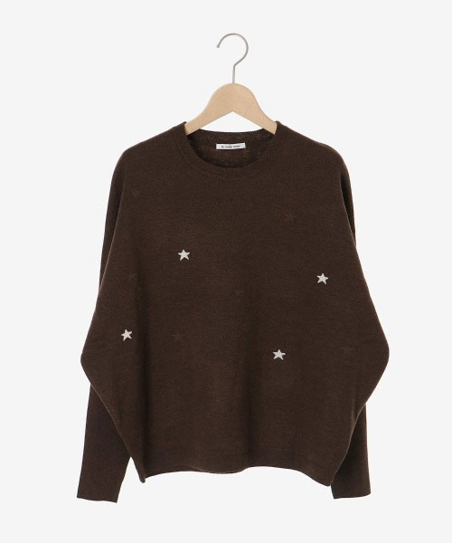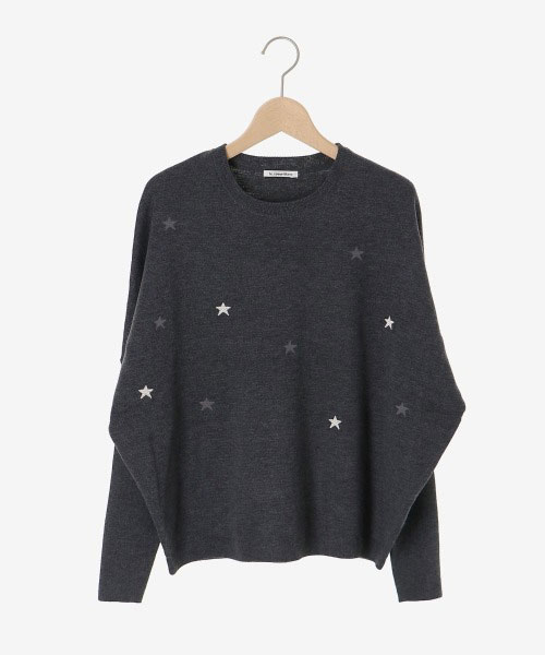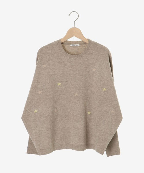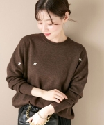 落ち着いたベースカラーにさりげなく散りばめられたスター刺繍がひかるクルーネックニット。●ポイント