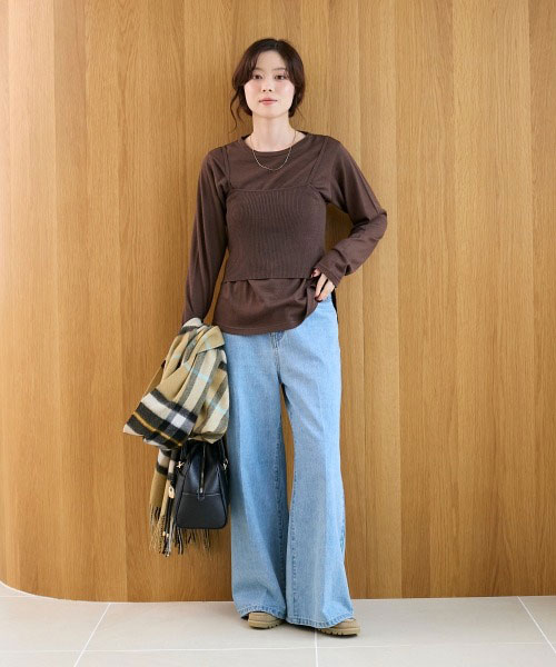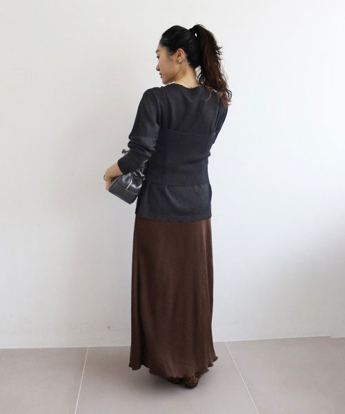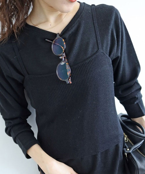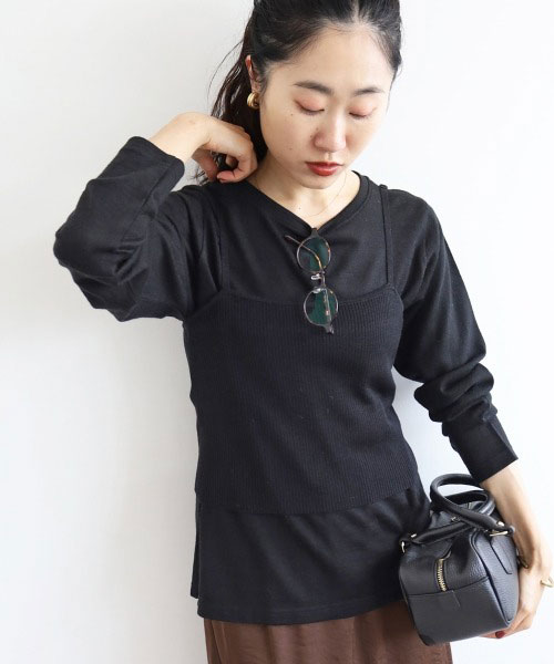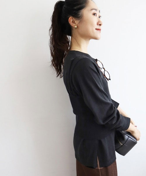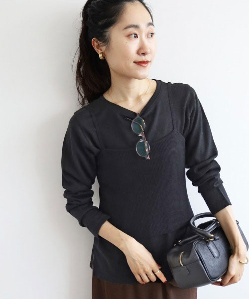 ワンピースやカットソーの上からニットビスチェを単品で合わせたり、長袖ニットトップス一枚でジャケットのインナーにも◎。
