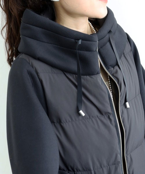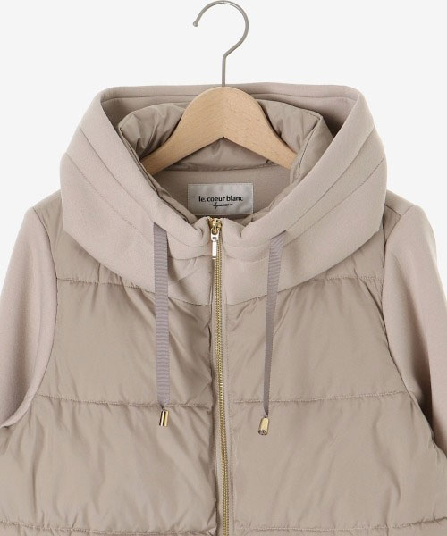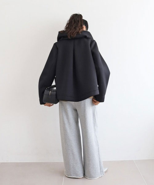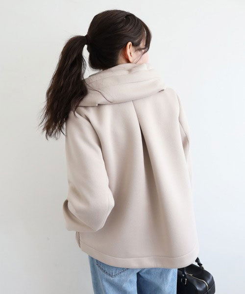 ボリュームをもたせた衿まわりのデザインが特徴的で、重心があがることでスタイルアップ効果も◎