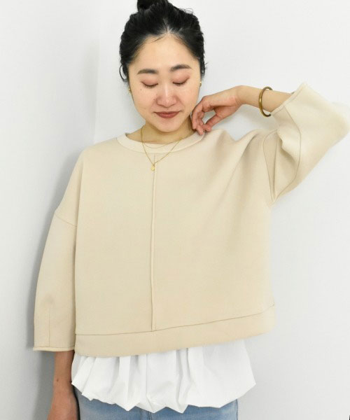 ダンボールニットトップスはコンパクトな着丈と構築的な袖シルエットと手首が見えるバランスがスタイルを良く見せてくれます。