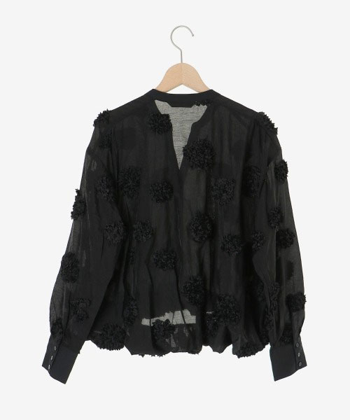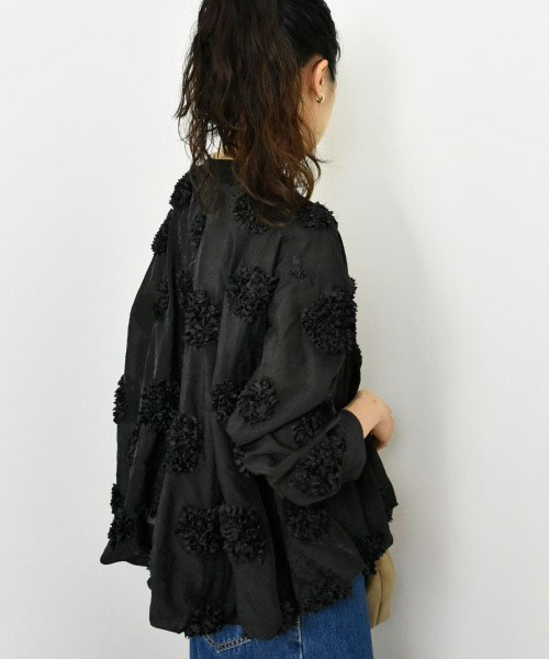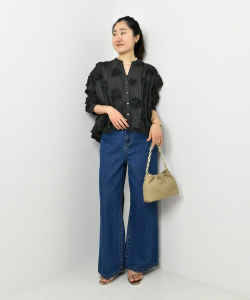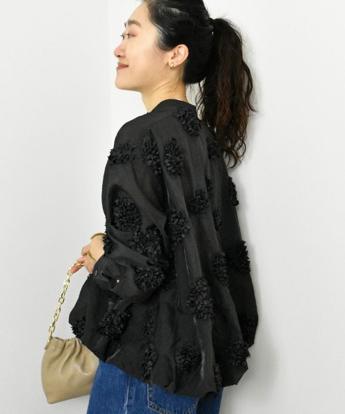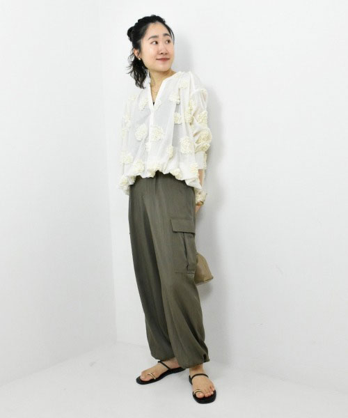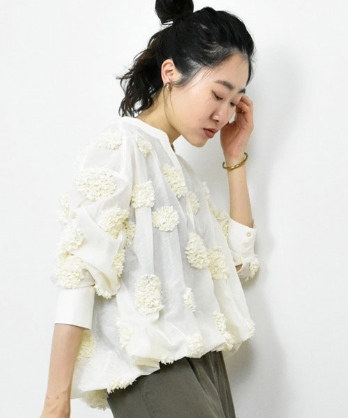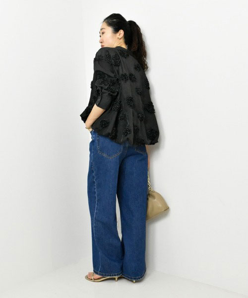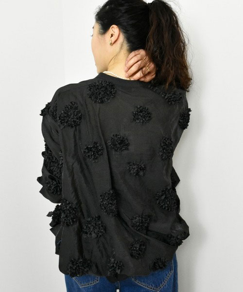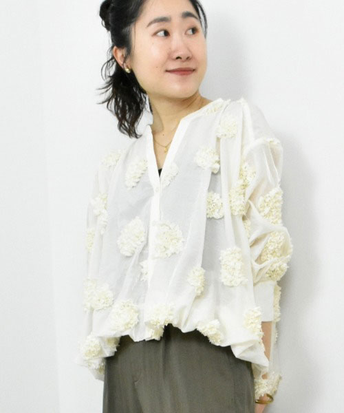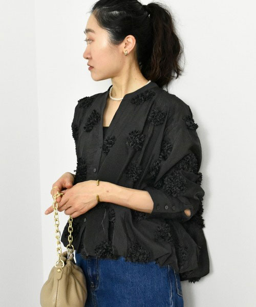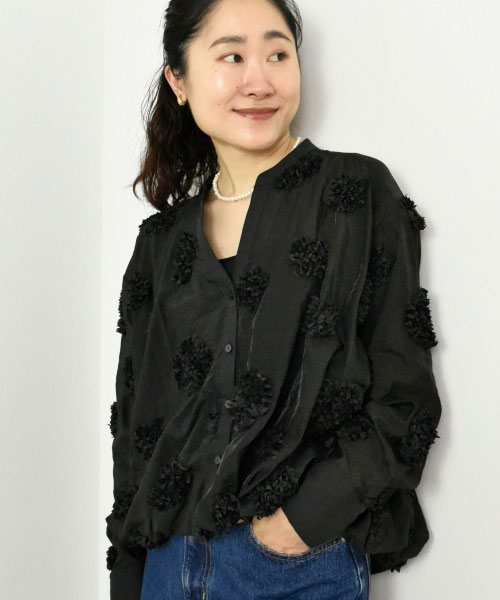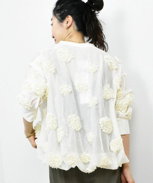大きめのフラワーモチーフで1点で華やかさを演出してくれるのでシンプルボトムと合わせるだけでも、着映えるブラウスです。