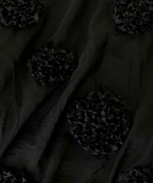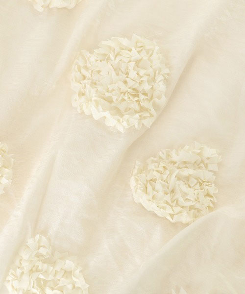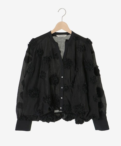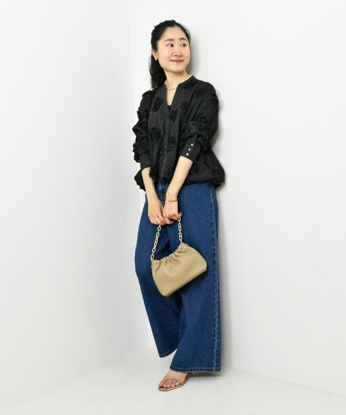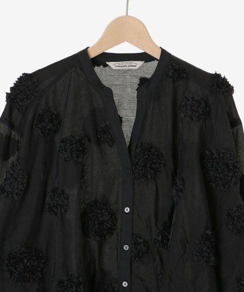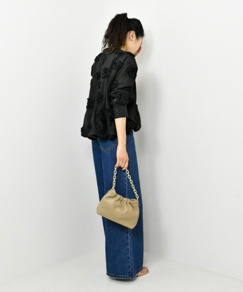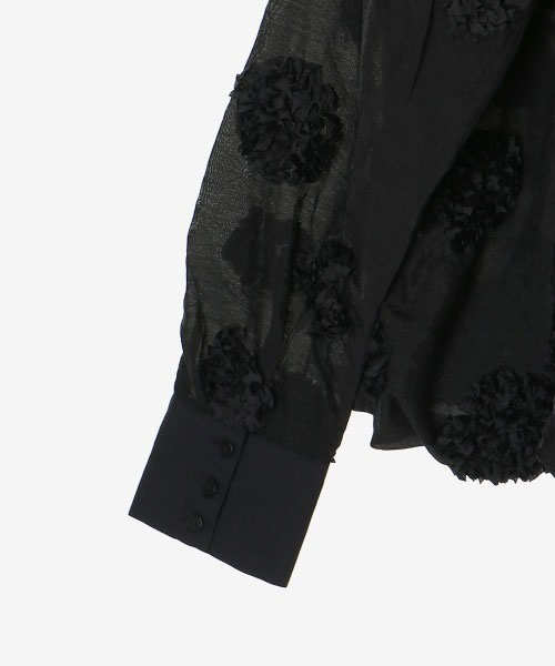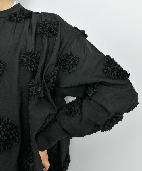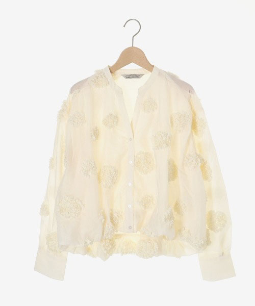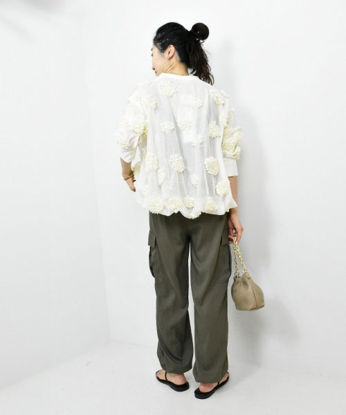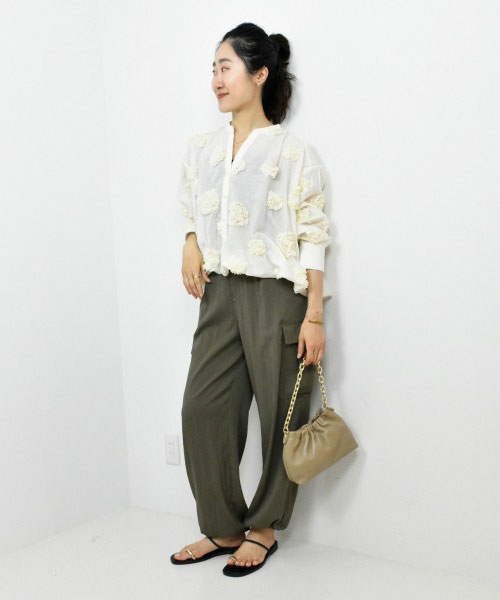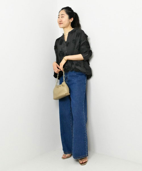 大きめのフラワーモチーフで1点で華やかさを演出してくれるのでシンプルボトムと合わせるだけでも、着映えるブラウスです。