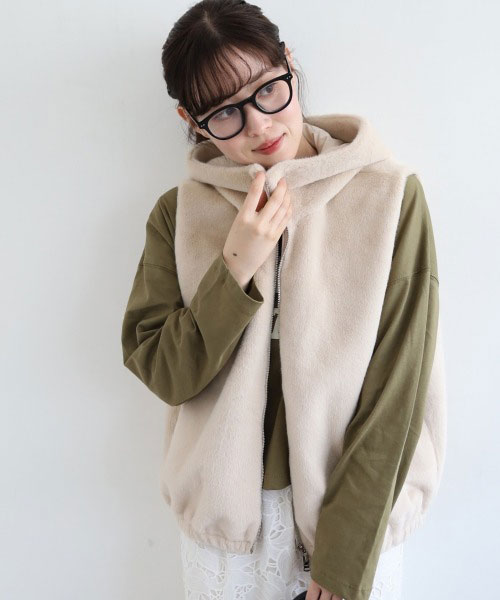 シンプルなコーデにアクセントを加えられる1着。暖かさとスタイルを両立させるファーフードベストでふわふわのファーフードが顔周りを華やかに。