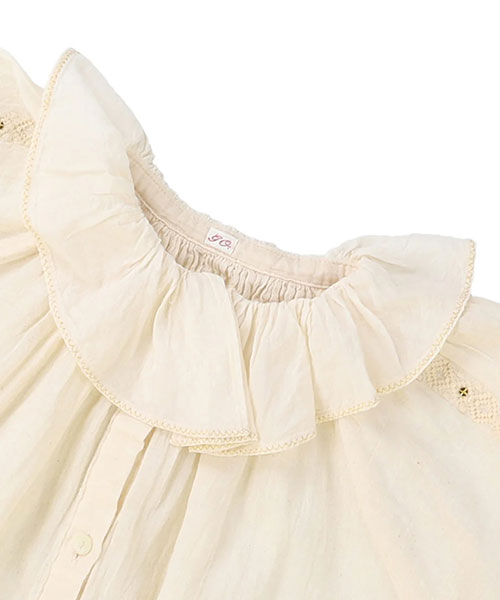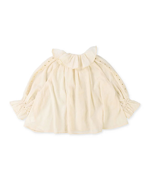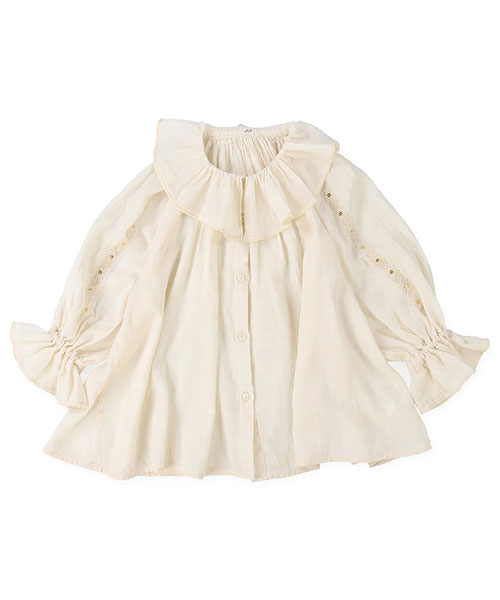 ホワイトの刺繍にゴールドのスパンコール刺繍。ふりふりの衿端にもキラりと輝くゴールドステッチがたまらないキラキラなブラウスです。ボリューミーな形がかわいいブラウスですが、素材が薄いので立ち上がりの羽織や、寒くなってきたらインナーとしても活躍いただけます。23AW/1238101とほぼ同シルエット。BRAND CONCEPT