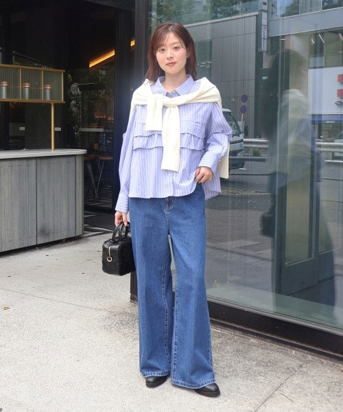 ストライプ柄がすっきりとした印象を与えつつ、フリルが甘さをプラス。
