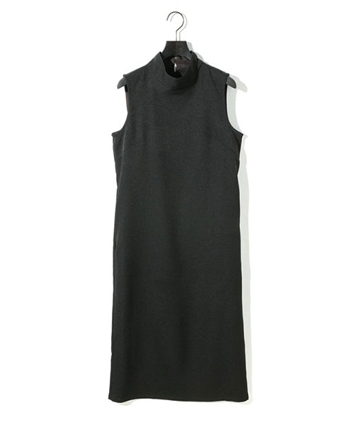 メランジ調(特殊染色)を施したリサイクル素材を使用したハイネックノースリーブワンピースです。バストダーツとウエストダーツを施したスレンダーな1枚。裾スリットがバックに入っているので足さばきの良いのもポイント。アームホールは狭めにしておりインナー見えがしないデザイン仕上げです。女性らしいシルエットが特徴でオン/オフどちらも使いやすいワンピースです。同シリーズ4-162196/フロントジップスカートも展開。
