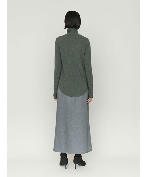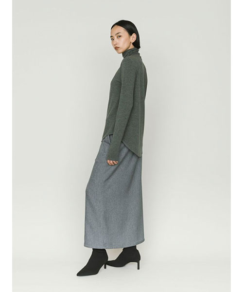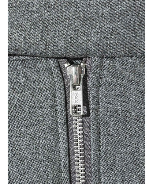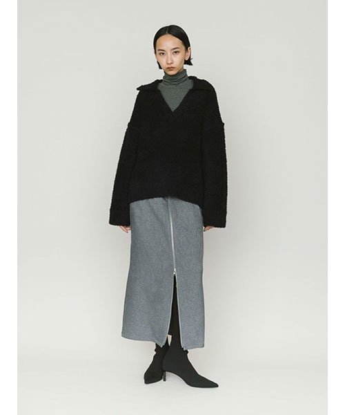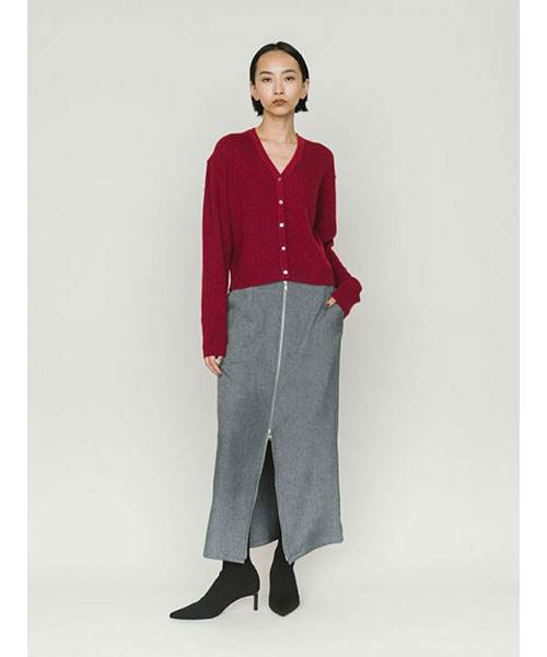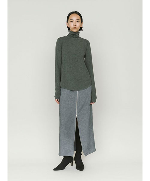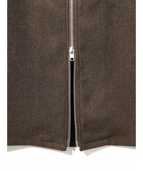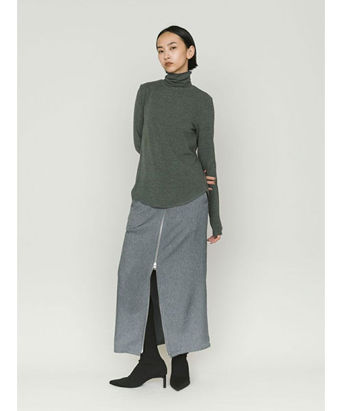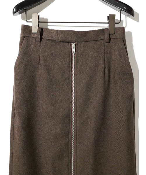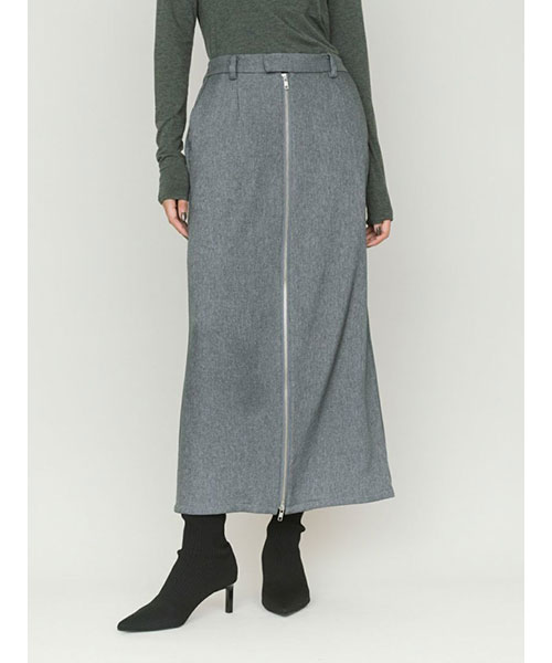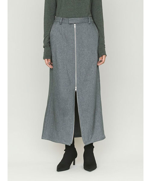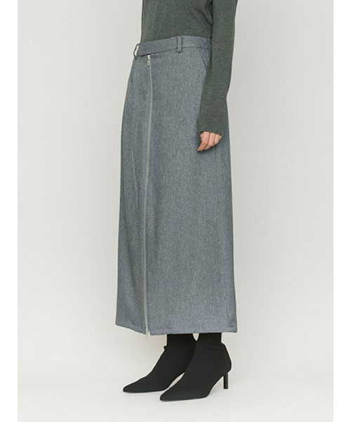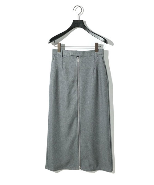 メランジ調(特殊染色)を施したリサイクル素材を使用したフロントジップスカートです。フロントにWファスナーを使用した特徴あるデザインスカートです。前を開けることができるデザインで、スリット感は好みで調整可能。レイヤードしてもOK。