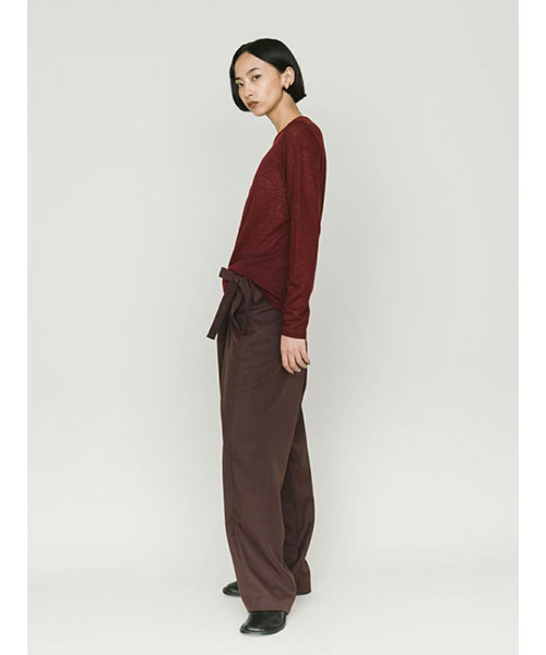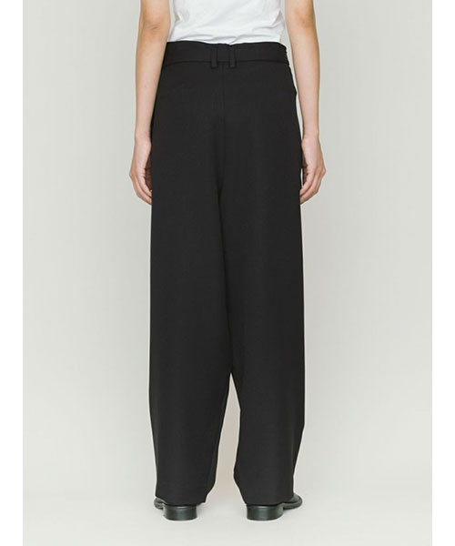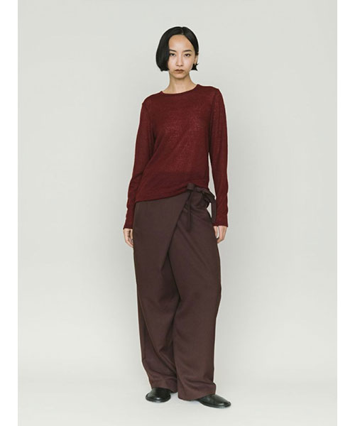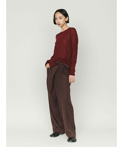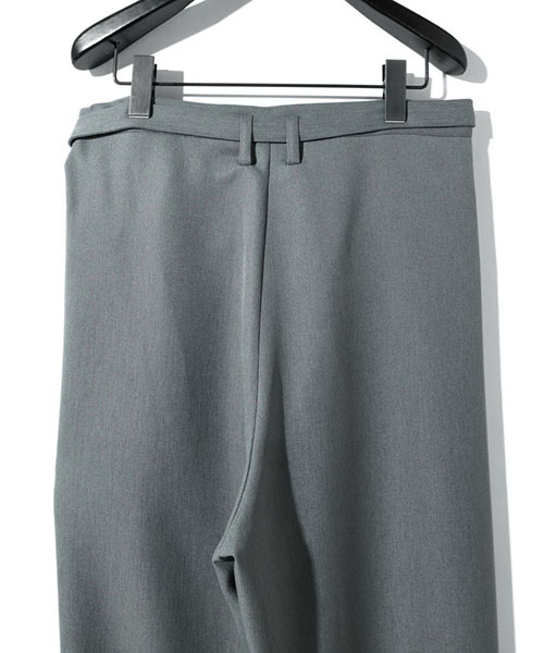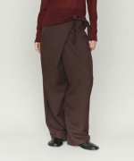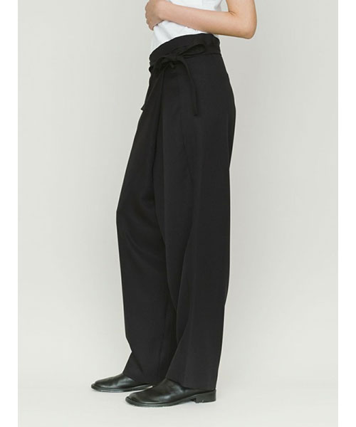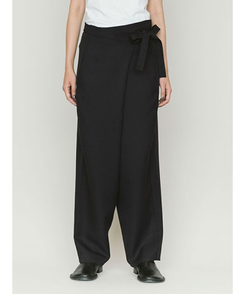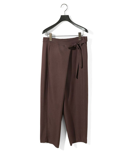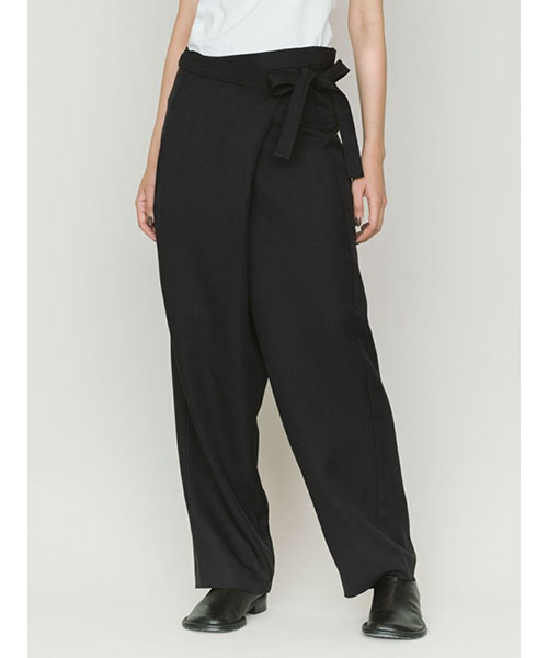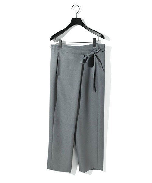 ワイドなウエストとドレープのきいたシルエットを表現したドレープラップパンツです。左サイドをベルトで絞ってウエストキープできる特徴的なデザインパンツ。サイズは自由自在。ユニセックスで着用可能。ボリューム感がありますが落ち感があるのですっきりとしたシルエット見えしてくれます。右側のみポケットが付いています。防シワ加工を施し日常使いしやすい生地を使用。印象的な着こなしを演出してくれるボトムアイテムです。4-135234/ドローストリングシャツとセットアップもおすすめです。Point