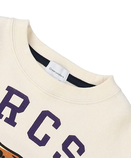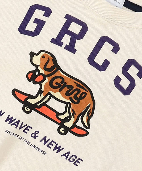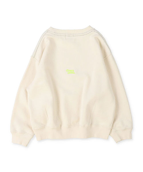 柔らかな裏毛素材を使用したクルーネックスウェット。サイズ感は、ややゆとりのあるGROOVY定番型。FRONTはBUDDY(スケボー犬)のプリント。BACKは蛍光色のロゴ刺繍。■素材
