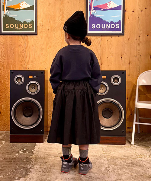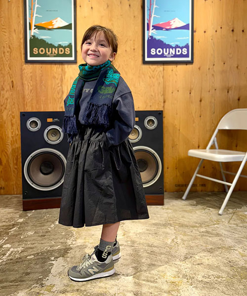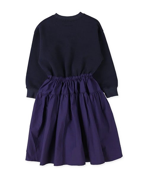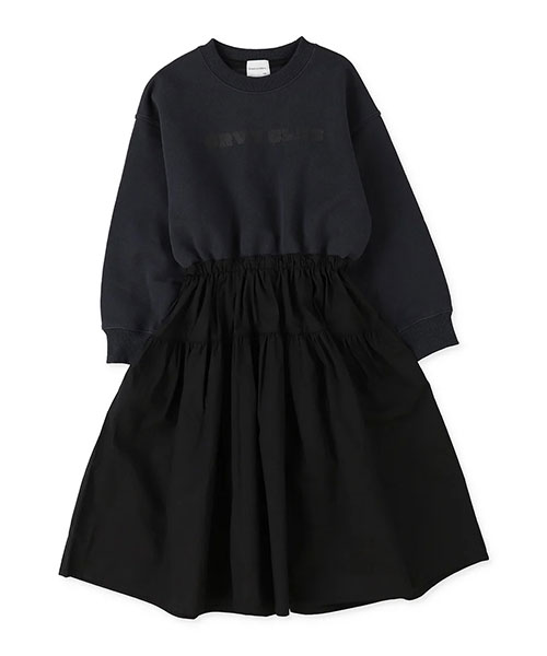 裏毛と布帛の合体ワンピース。スカート部分は801と同様のローン生地を使用。黒系と紺系の2色展開でどちらも同一カラーのトーンになっています。プリント部分にはロゴを同色系と目立つカラーでプリント。ウエスト部分にはゴムが入っておりますので、ウエスト部分でタブらせて着用ください。この1枚にアウターを羽織れば、冬のスタイリングが完成します。■仕様