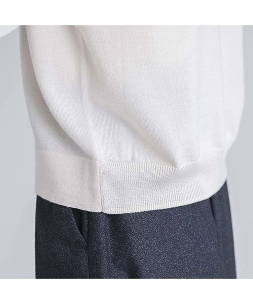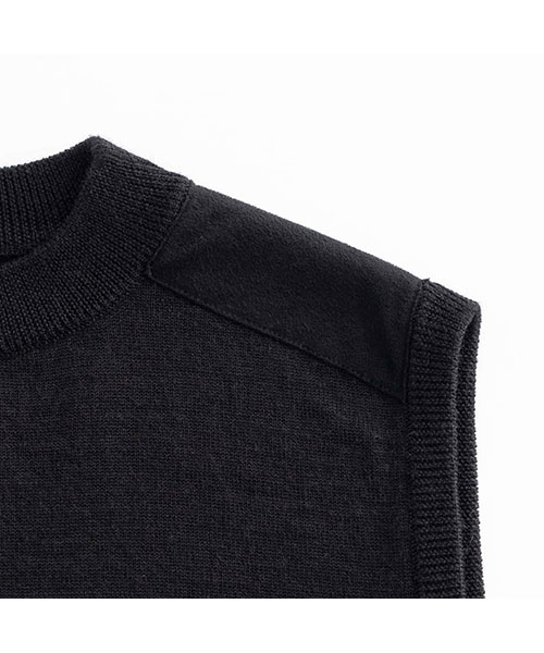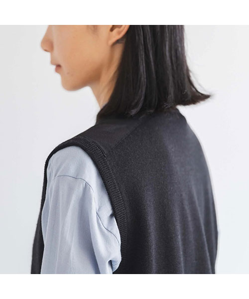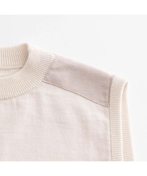 着回しが効いてトラッドな雰囲気を纏えるシンプルなベスト。細番手で毛羽の少ない糸で編み上げた編地は、さらっとした風合いとほどよい落ち感が上品な印象。 自宅でのお洗濯も可能です。ショルダー部分に、スエード調のパッチをポイントに配しました。 編地とのコントラストがさりげなくポイントになっています。