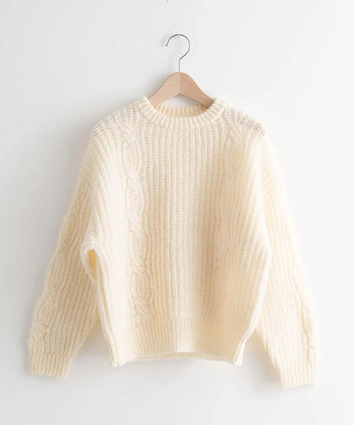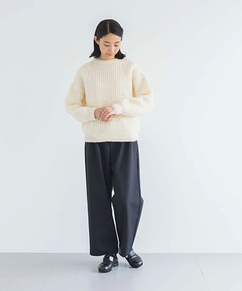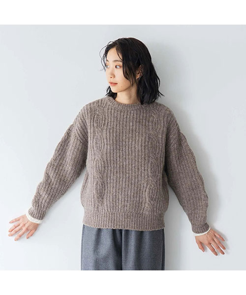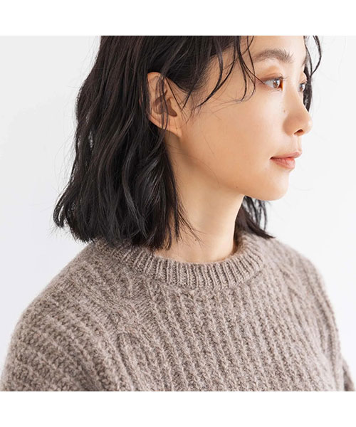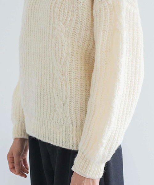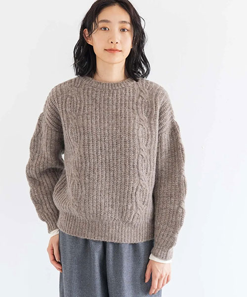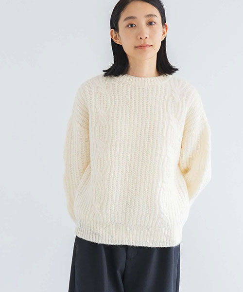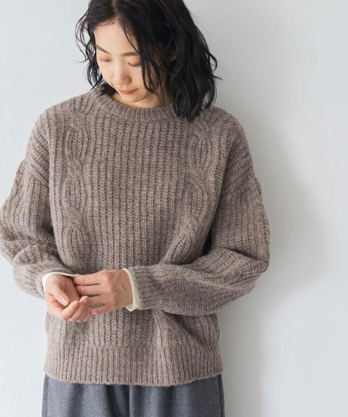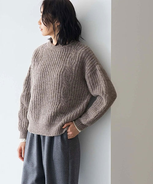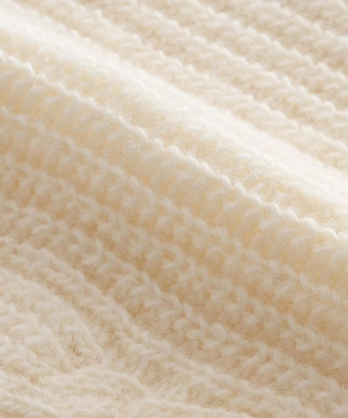 ナチュラルなざっくりとしたウールの素材感と編み柄が特徴の、ほどよいチャンキー感を楽しめるセーター。 真冬に暖かくしてくれる、コーディネートのポイントになるアイテムです。