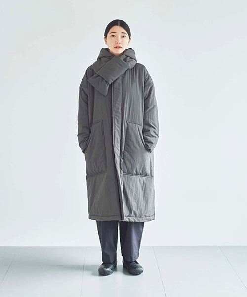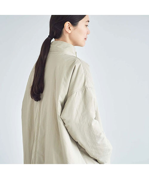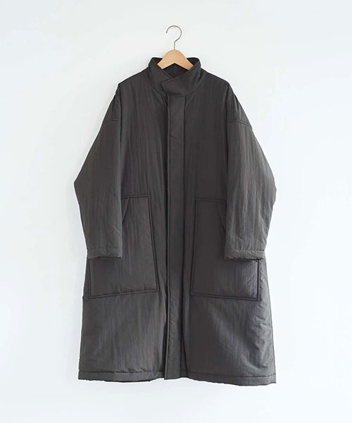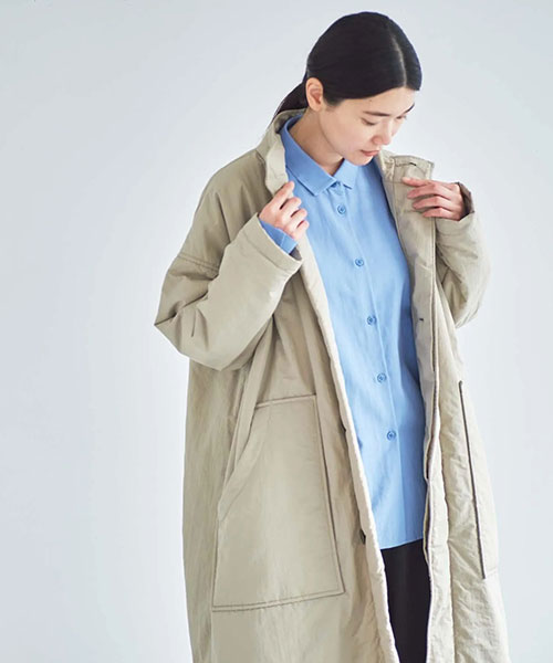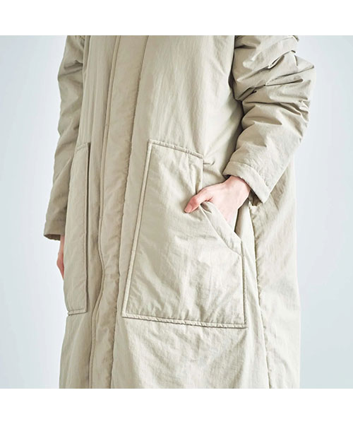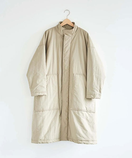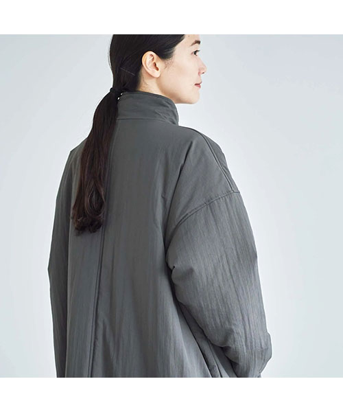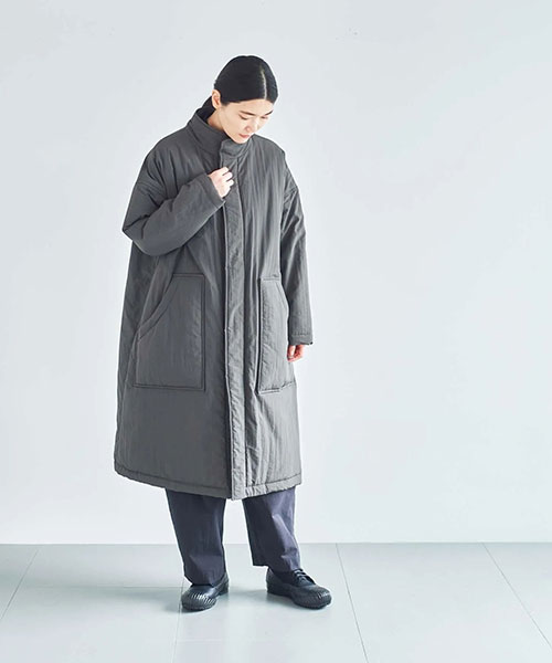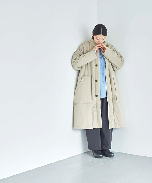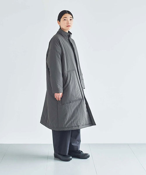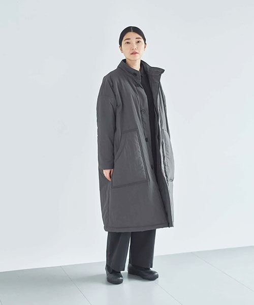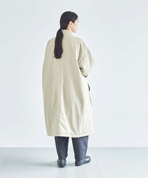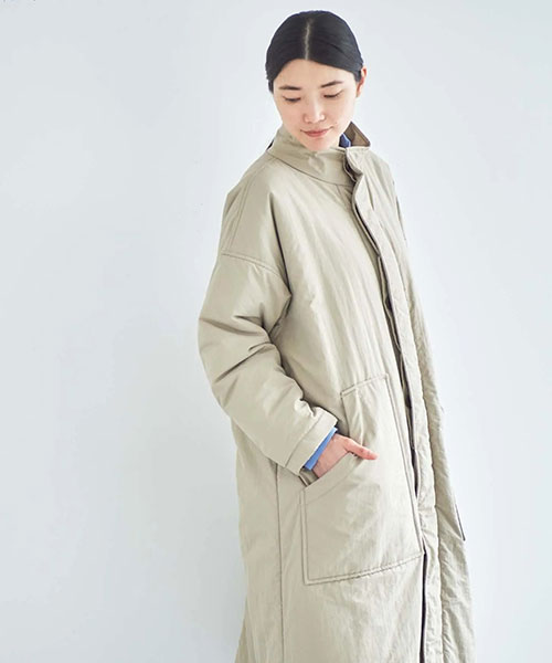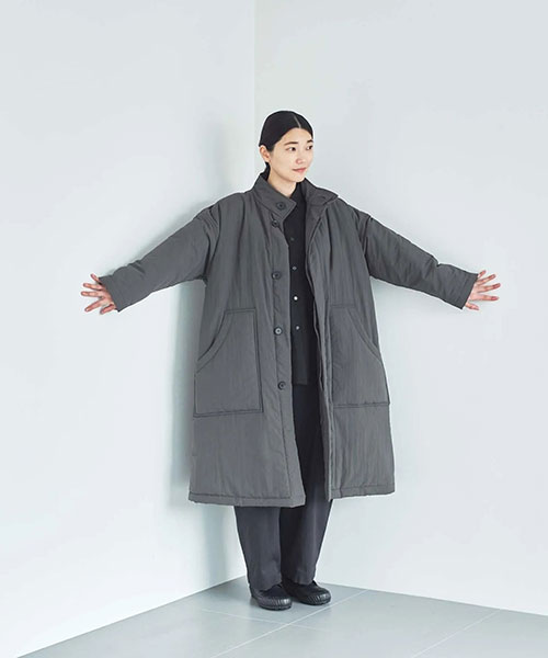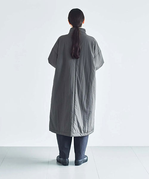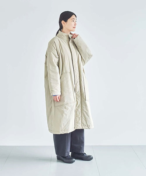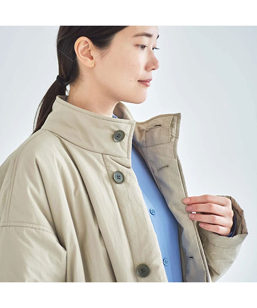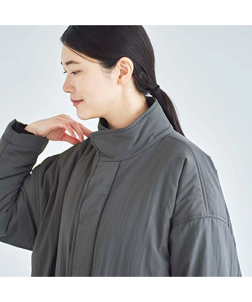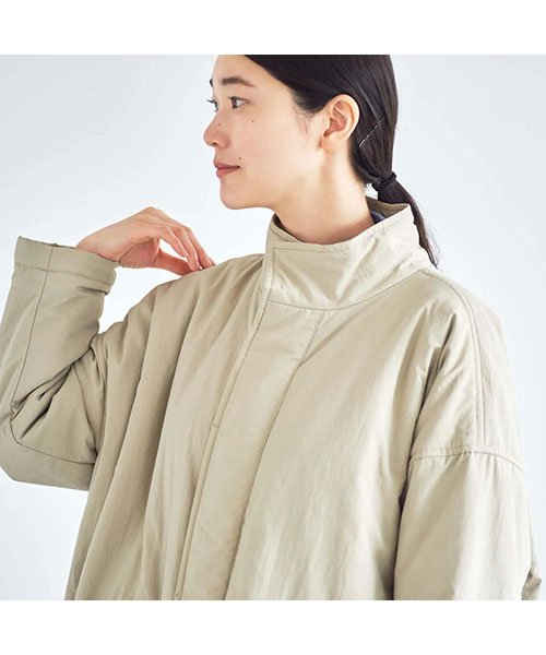 全体に中綿の入った暖かなコートは、首元をカバーしてくれるスタンドカラーがポイント。