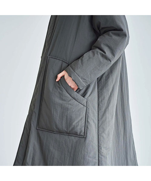 全体に中綿の入った、暖かなコートができました。落ち着きのあるマットなナイロンを使用。