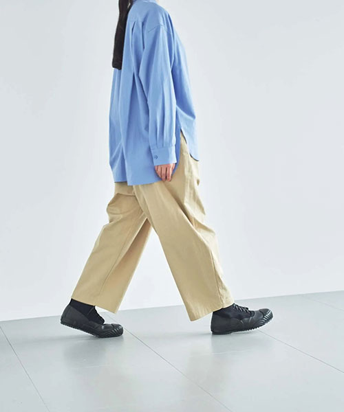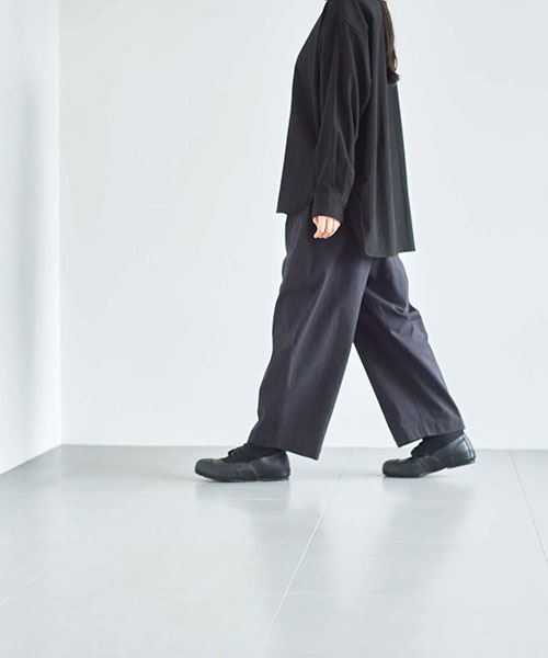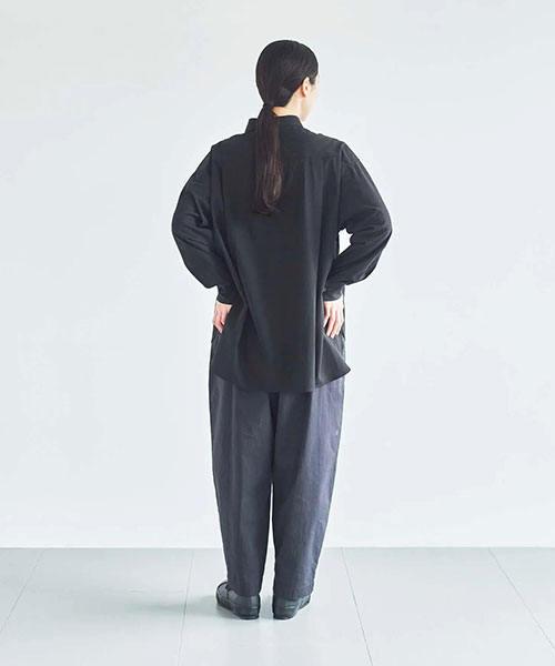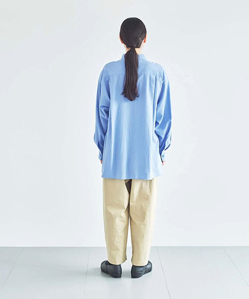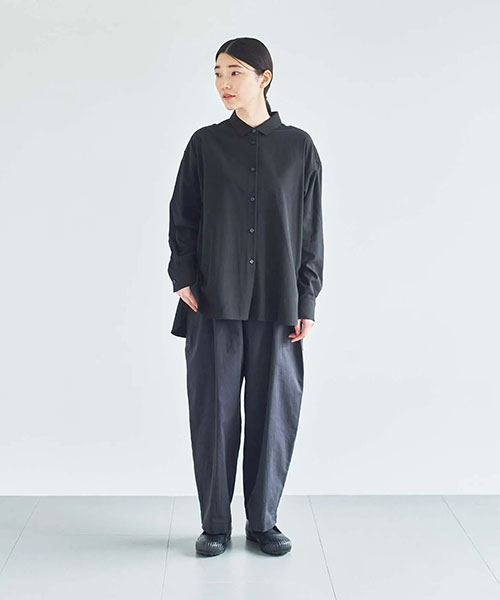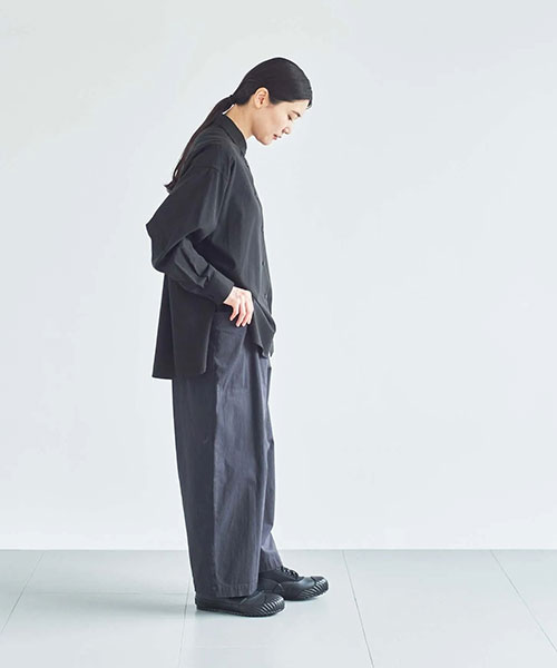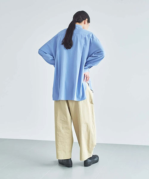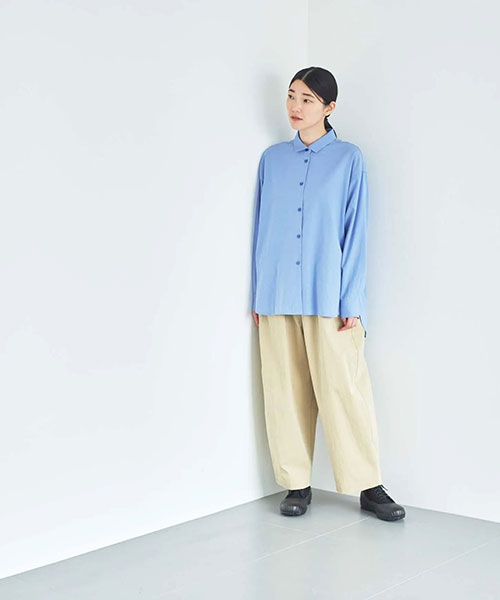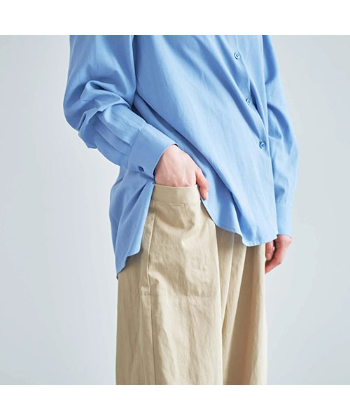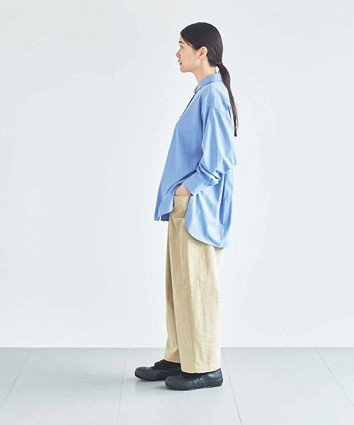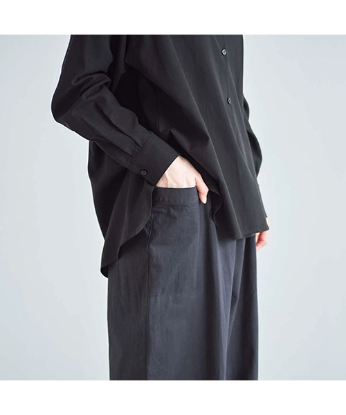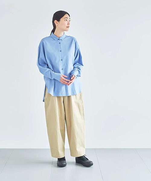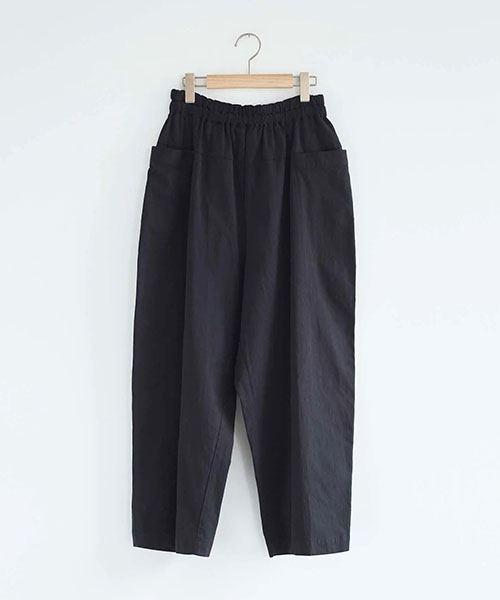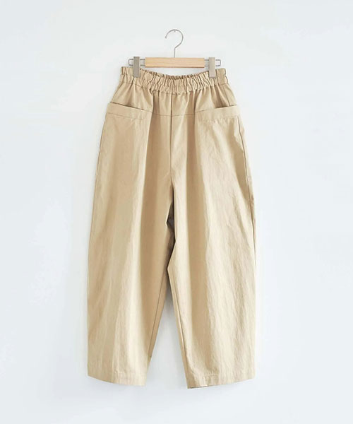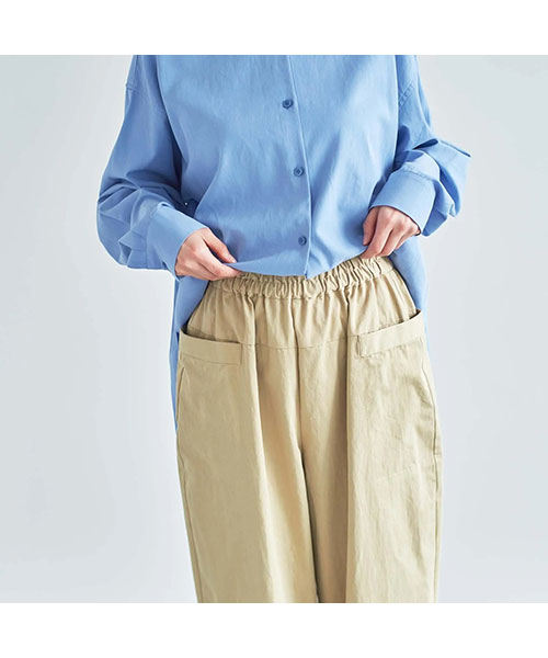 適度に張りと落ち感のあるコットンレーヨンを使用。幅広い体系の方にも着やすいボリューム感のあるコクーンシルエットのパンツは、両サイドに施した大きなポケットがポイントです。動きやすいようにウエストも前後ぐるりとゴム仕様にしました。