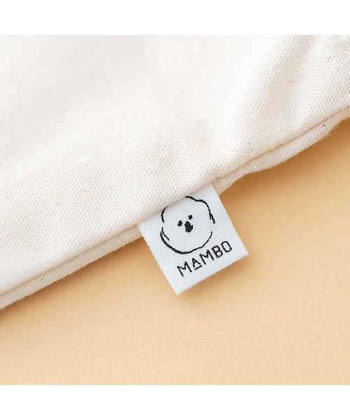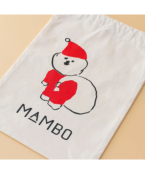 イラストレーター 塩川いづみさんの描いた、ビション・フリーゼという犬がモチーフ。人気の MAMBO のクリスマスシーズン限定巾着ができました。こちらは、サンタクロースの恰好をした MAMBO の巾着です。