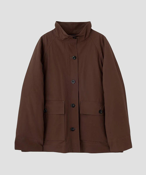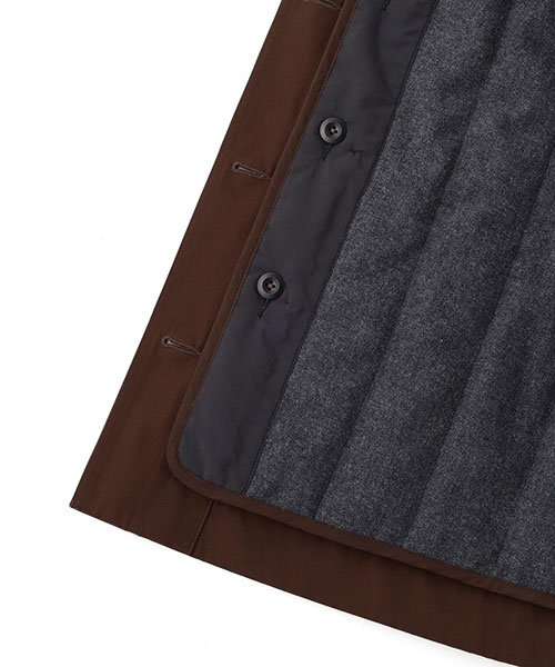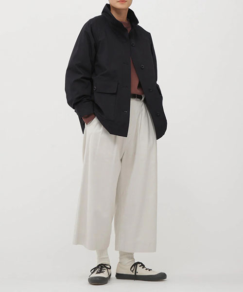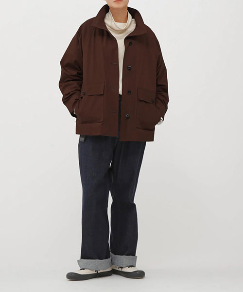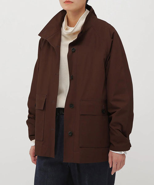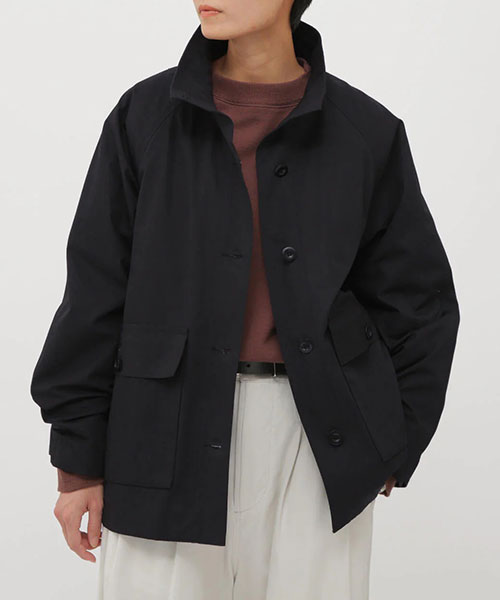 ヴィンテージのハンティングジャケットから着想を得たスタンドカラーデザイン。ラグランスリーブのボクシーシルエットに、前後から手を入れられるフロントポケットを組み合わせた仕様。ウールと中綿を合わせたライナーは着脱可能で、シーズンを通して活躍するアウター。