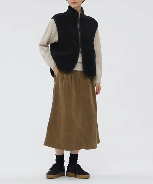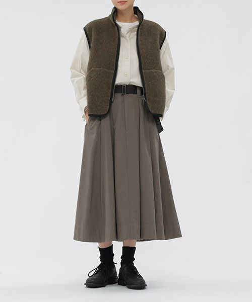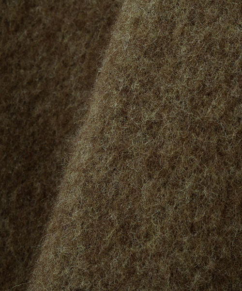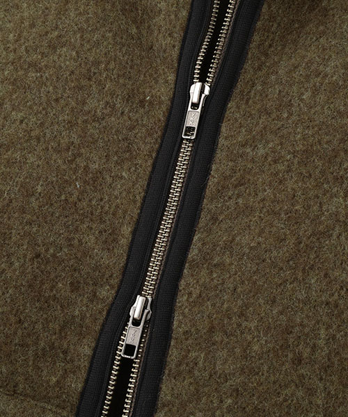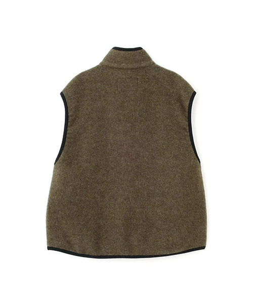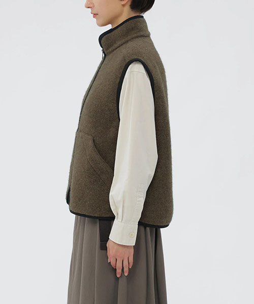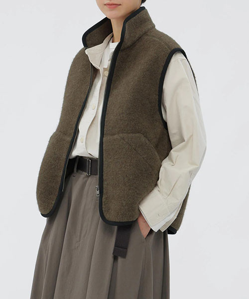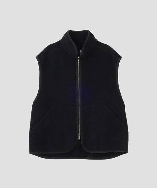尾州で織り上げたメリノウールを使用したフリース素材のベスト。二重織りに両面起毛を施し、肌に触れる部分はすべてウールとなる贅沢な仕立て。スーツ地で用いられる梳毛をあえて取り入れ、柔らかくしなやかな風合いが特長。ミリタリーライナーをベースにアレンジし、パイピングで軽やかさを出した仕上げ。スタンドカラーのカッティングと大きなカンガルーポケットを組み合わせたデザインで、フロントはジップ仕様にすることでレイヤードのしやすさを備えた一着。