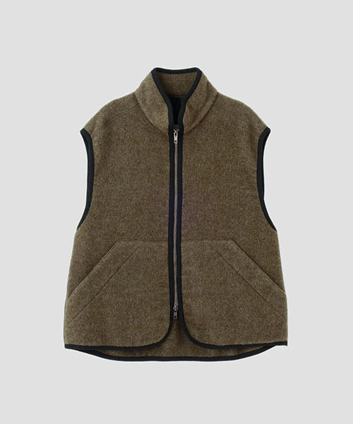 尾州で織り上げたメリノウールを使用したフリース素材のベスト。二重織りに両面起毛を施し、肌に触れる部分はすべてウールとなる贅沢な仕立て。スーツ地で用いられる梳毛をあえて取り入れ、柔らかくしなやかな風合いが特長。ミリタリーライナーをベースにアレンジし、パイピングで軽やかさを出した仕上げ。スタンドカラーのカッティングと大きなカンガルーポケットを組み合わせたデザインで、フロントはジップ仕様にすることでレイヤードのしやすさを備えた一着。