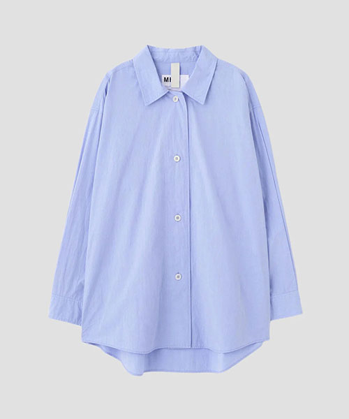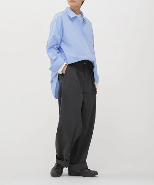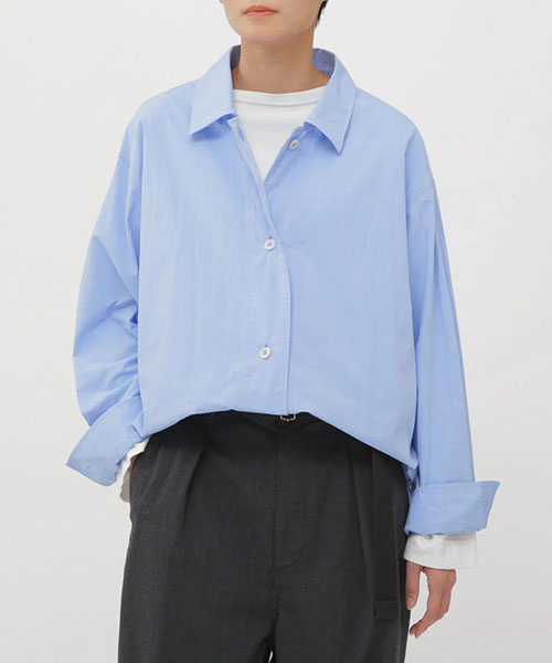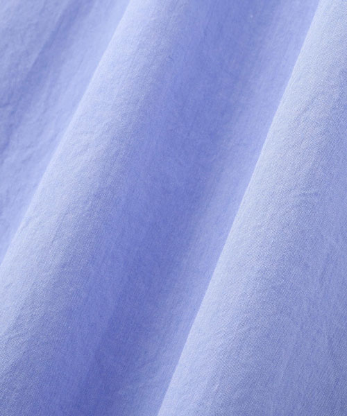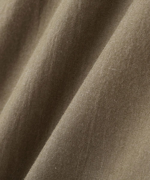 コットンシャンブレーを使用したシャツ。カジュアルな番手の糸を高密度に織り上げ、ワッシャー加工でペーパーライクな質感に仕上げた素材感が特長。軽やかさと張りをあわせ持つ風合い。