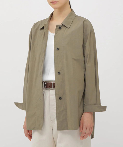 着丈を長めにしたリラックスフィットのシルエット。オープンカラーとワイドな見返しによるフラットな表情に、裾のカッティングが個性を加えるデザイン。一枚着としても、ニットとのレイヤードでアクセントになるアイテム。