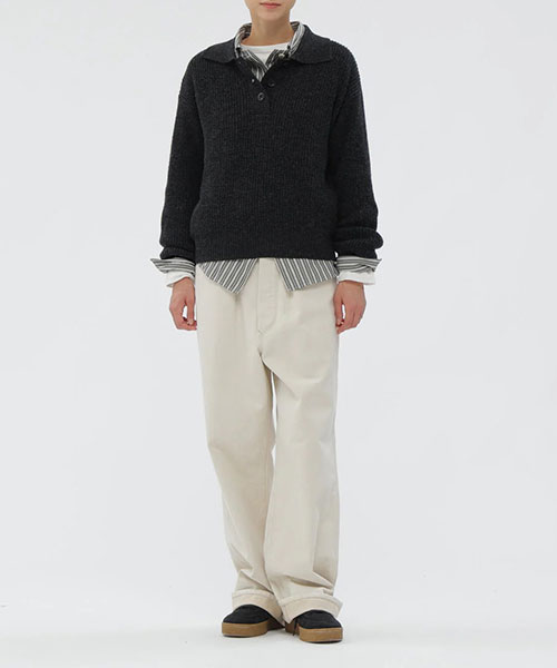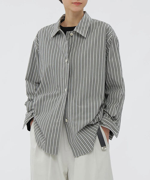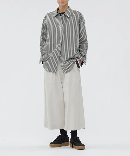 着丈を長めにしたリラックスフィットのシルエットで、オープンカラーとワイドな前立てを組み合わせたフラットなデザイン。襟には月腰切り替えを入れて着心地を高め、個性的な裾ラインは一枚着としてはもちろん、レイヤードのアクセントにもなる一枚。