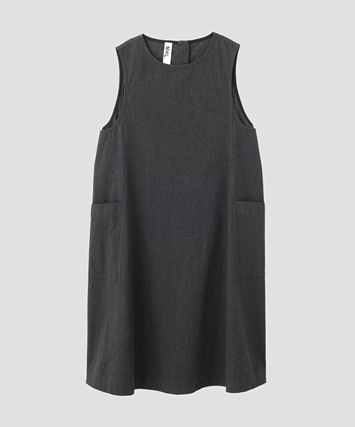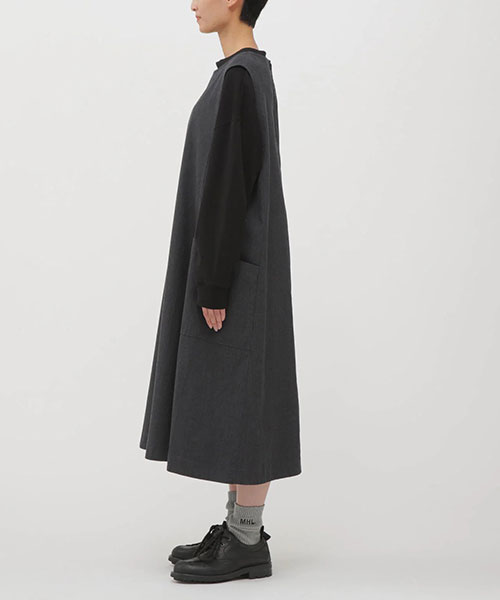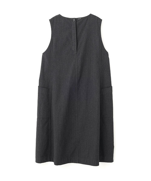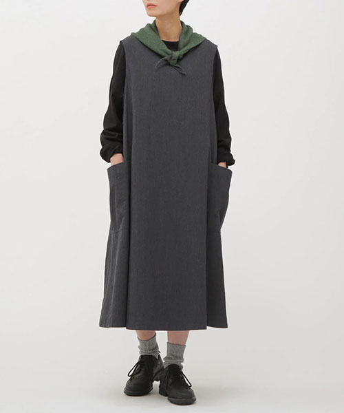 ウールとコットンを高密度に織り上げたツイル素材のテントラインドレス。ウールの暖かみとコットンのカジュアルな風合いをあわせ持ち、仕上げを抑えることで素材本来の表情を活かした一着。パネル切り替えで構成したドレスは、身幅から裾にかけて広がる分量感と、大きな腰ポケットや後ろのボタンフライがアクセント。ノースリーブに広めのアームホールを組み合わせ、インナーを重ねることで着こなしが楽しめる仕上がり。※こちらはウィメンズの商品です。